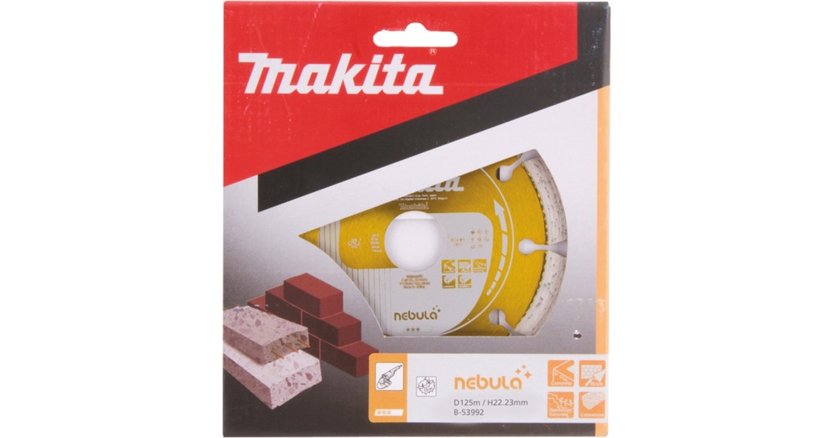 Die lasergeschweißte Diamant-Trennscheibe Nebula B-53992 von Makita ist für Mauerwerk, Beton, weiche Ziegel, Marmor, Schiefer, Zementziegel und allgemeines Baustellenmaterial, sogar für armierten Stahlbeton, vorgesehen. Mit 22,23mm Bohrungsdurchmesser eignen sie sich für kleine Standard Winkelschleifer mit Spannmutter wie z.B. die Akku-Winkelschleifer DGA511, DGA513 oder DGA517.Art.-Nr.: 1609591
