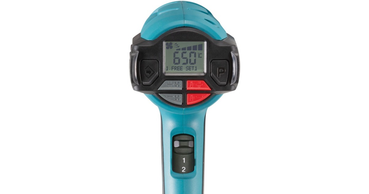 Das Makita Heißluftgebläse HG6531CK ist ein besonders leichtes, universelles Gerät mit 2.000 Watt Leistung. Die Temperatur lässt sich in 5°C Schritten zwischen 50°C und 650°C am übersichtlichen LCD-Display regeln. Außerdem bietet es fünf verschiedene einstellbare Luftfördermengen. Es eignet sich hervorragend zum Entfernen von Aufklebern, zum Trocknen, Auftauen und Entfernen alter Lacke, Aufbringen von Kantenumleimern, Schrumpfen von Schrumpfschläuchen, Desinfizieren von Tierkäfigen, Anzünden von Grills und vielem mehr. Der Überhitzungsschutz mittels Thermostat sorgt für ein selbstständiges Abschalten des Heizelements bei Überlastung. Der Motor des Heißluftgebläses HG6531CK liegt rechtwinklig zum Hauptluftstrom und ist dadurch vor Verunreinigungen geschützt. In Pausen kann das Gebläse zum Abkühlen aufrecht hingestellt oder an der im Griff integrierten Öse aufgehängt werden.Art.-Nr.: 1585906