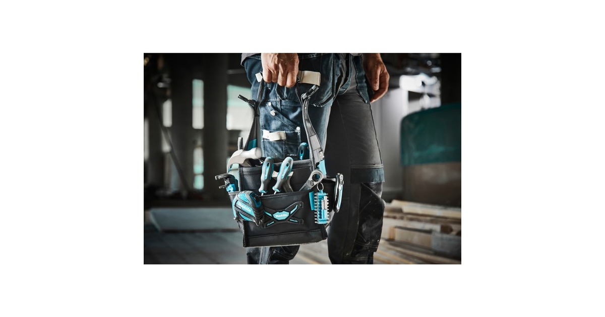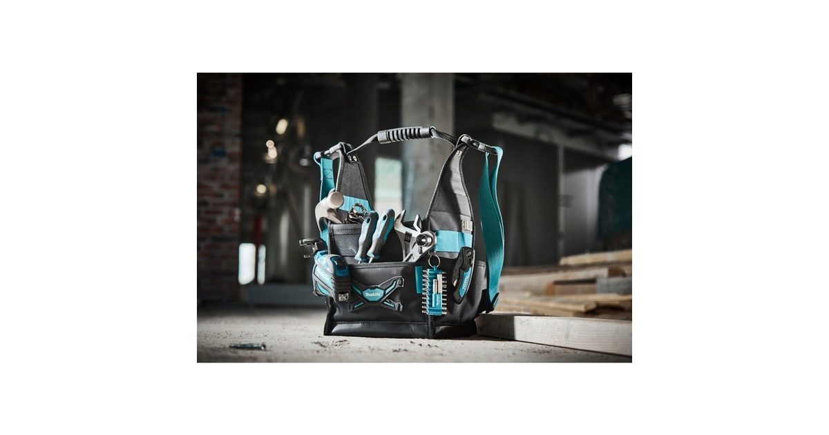 Die quadratische Werkzeugtasche verfügt über sechs Außenfächer, sechs elastische Bänder sowie acht weitere innenliegende Bänder und Bit-Halter. Ein Edelstahl-Maßbandhalter befindet sich an der Außenseite. Art.-Nr.: 1743733