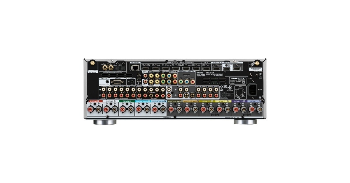 5x 3,5-mm-Klinke, 7x HDMI, 2x Koaxial, 2x Optisch, 1x Phono, 8x Stereo-Cinch, 3x Video-Cinch, 3x YUV |