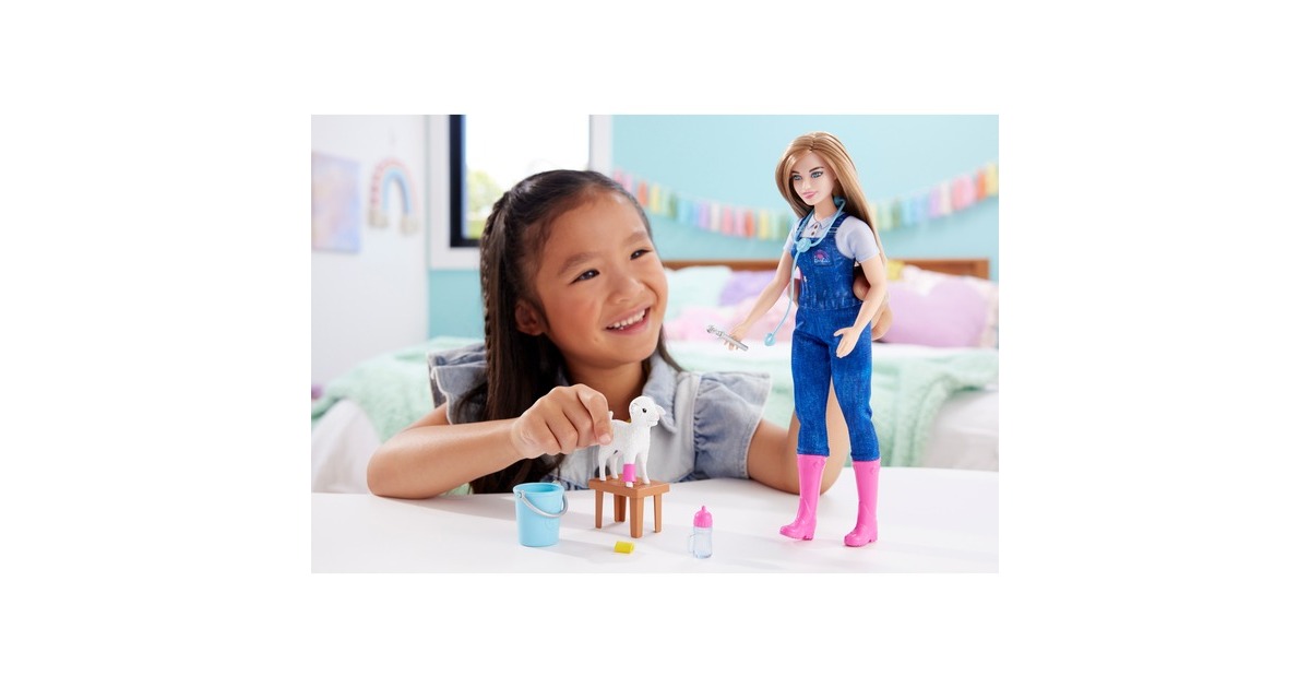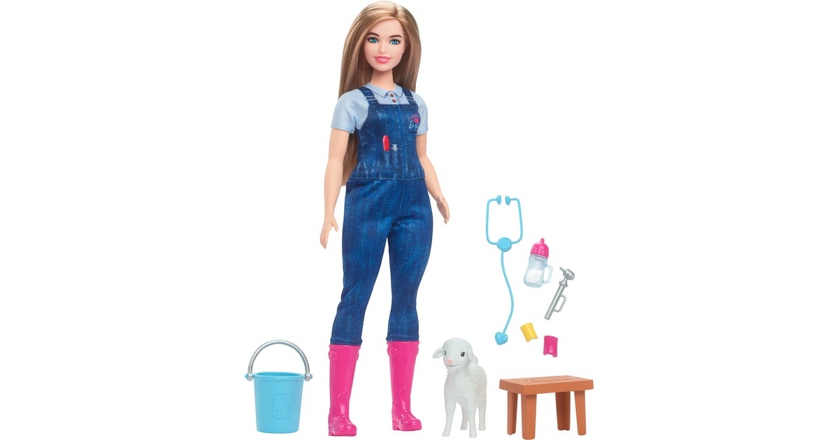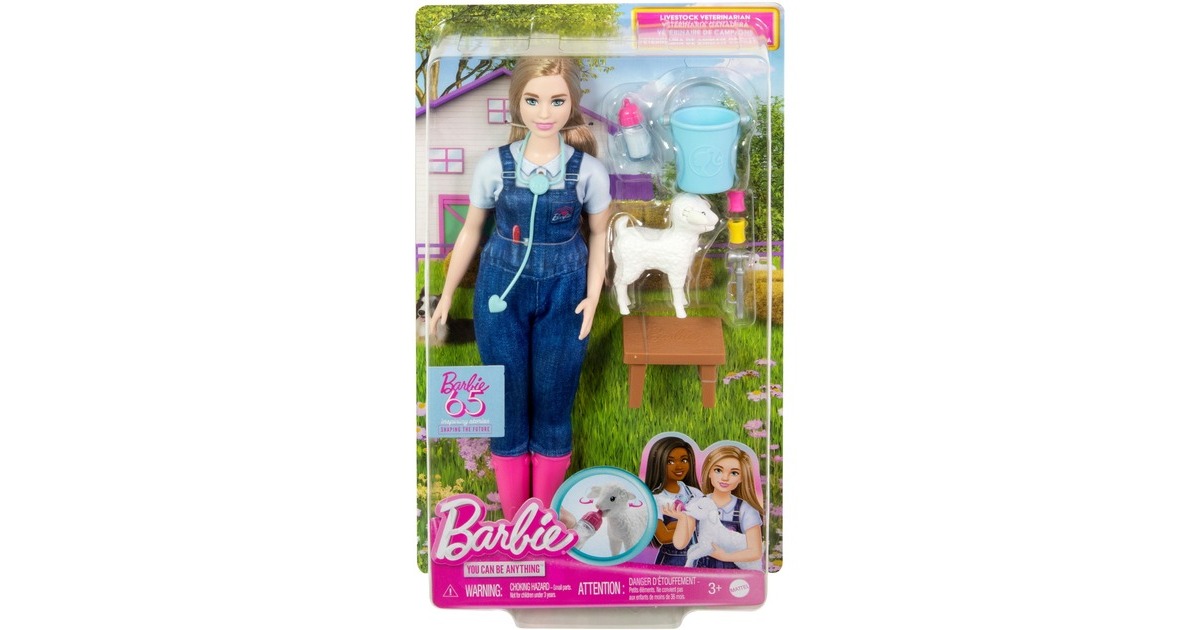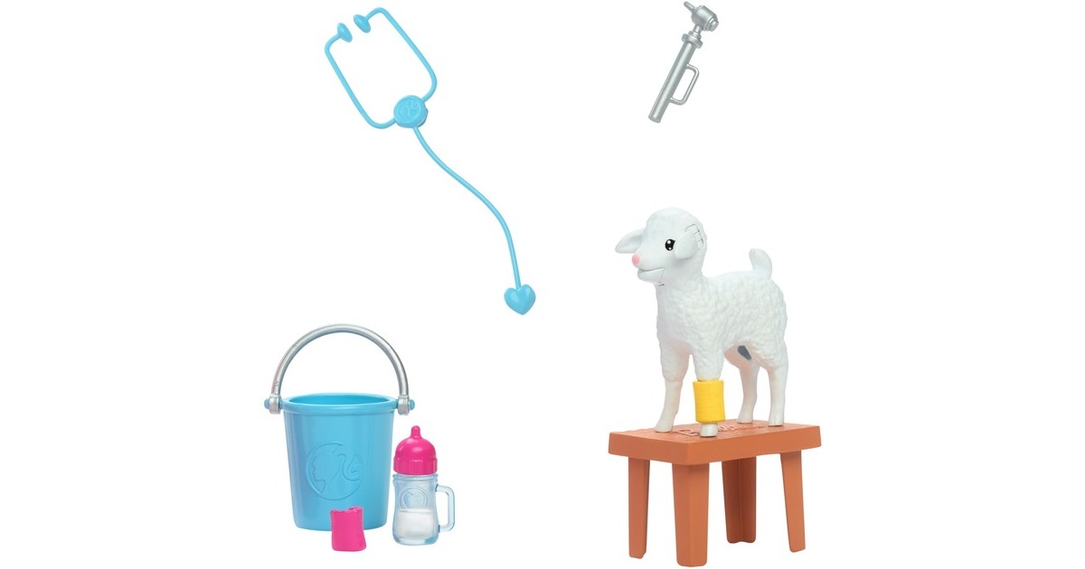 Zum 65. Jubiläum präsentiert Mattel eine weitere Barbie-Puppe aus der Karriere-Serie: Die Bauernhof-Tierärztin ist für jeden Notfall gut ausgerüstet. Sie trägt ihre Berufskleidung - eine Latzhose mit Taschendetails und pinke Gummistiefel. 10 Zubehörteile passen perfekt in das Tierarzt-Thema dieses Sets. Mit dabei sind unter anderem eine Bank, ein Eimer, ein Reflexhammer, ein herzförmiges Stethoskop und zwei Gipsverbände, die dem Lamm angelegt werden können. Bekommt das niedliche Lämmchen sein Arzneimittel aus der Flasche, wackelt es süß mit den Ohren! Die Kleidung der Puppe ist ausziehbar. Art.-Nr.: 100025586