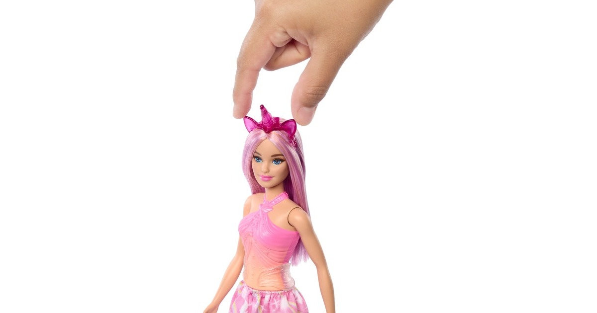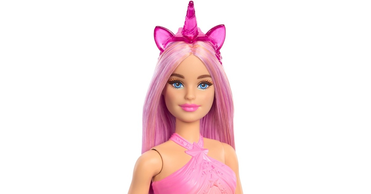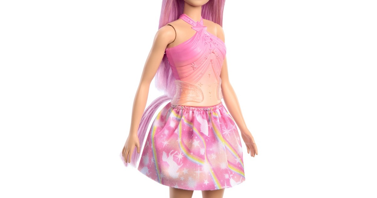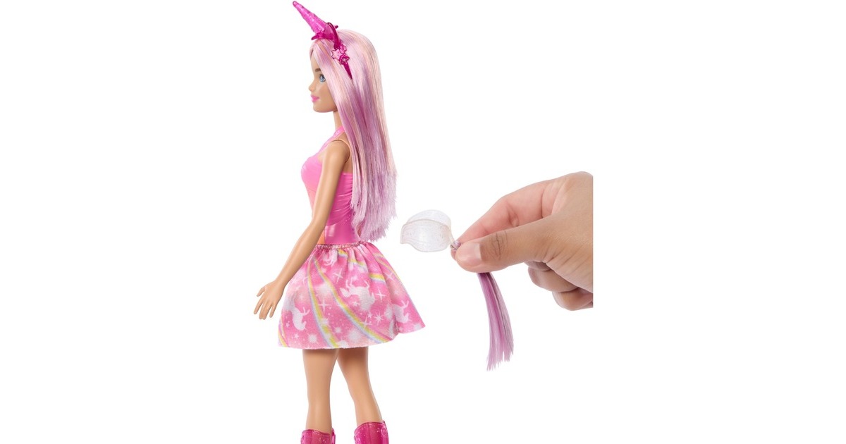 Einmal ein Einhorn sein: Diese Barbie-Puppe macht diesen Wunsch wahr. Sie trägt einen transparenten Haarreif mit Horn und Ohren, der perfekt zu ihren langen pinken Haaren passt. Und auch die weiteren Teile ihres Outfits sind einfach magisch: Das pinke Oberteil mit Neckholder wird ergänzt von einem Rock mit Regenbogen und Einhorn-Dekorationen. Die hohen rosa Stiefel runden das Outfit ab, das direkt aus einer anderen Welt zu kommen scheint. Art.-Nr.: 100025568