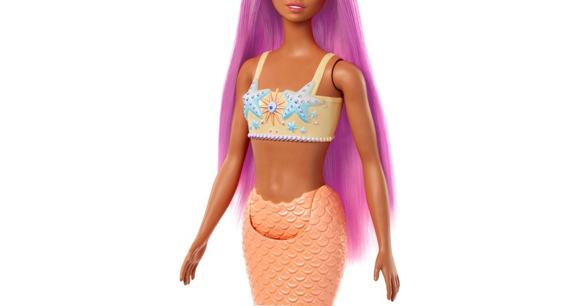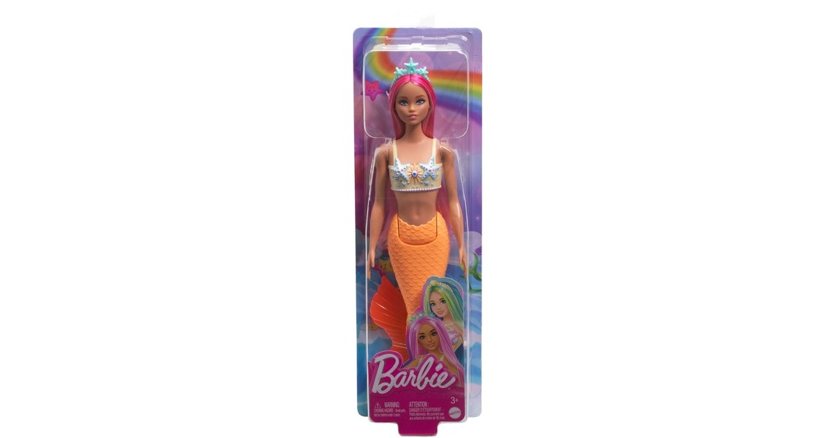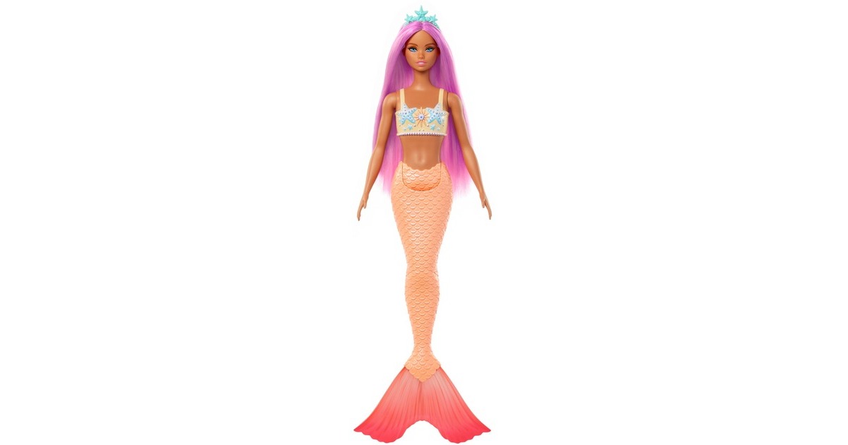 Die Puppen aus der Meerjungfrauen-Kollektion von Barbie Dreamtopia laden zu fantasievollem Spiel rund um Geschichten über Freundschaft und fantastische Unterwasserwelten ein. Jede Puppe trägt ein Muscheloberteil und hat eine detailliert gearbeitete Schwanzflosse. Farbenfrohes Haar ist mit fein gearbeiteten Accessoires verziert. Diese Puppe hat eine orangefarbene Schwanzflosse und Haar mit pinken und orangefarbenen Strähnen. Art.-Nr.: 100025559