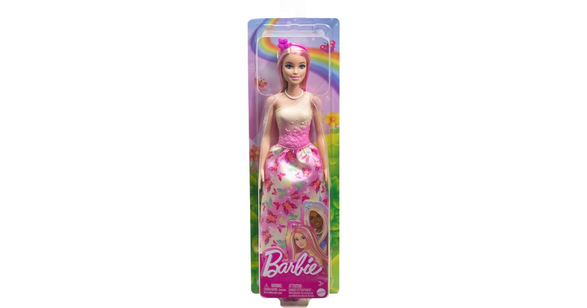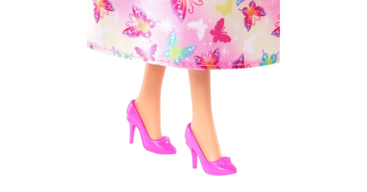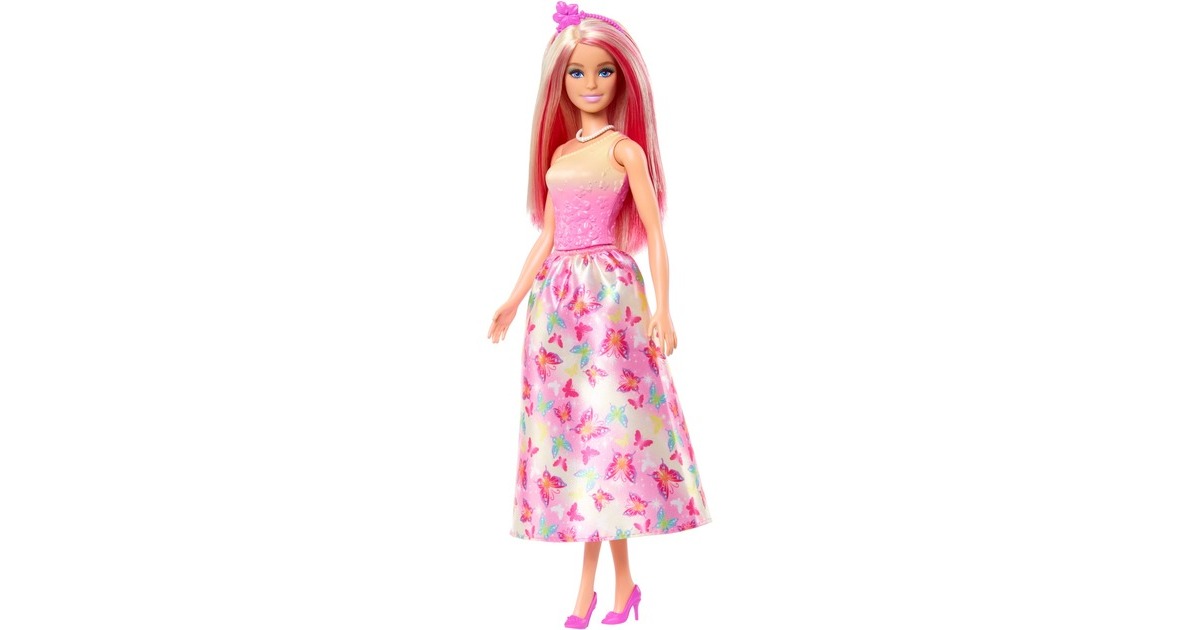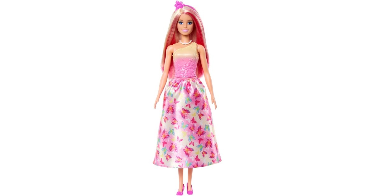 Die royalen Puppen aus der Serie Barbie Dreamtopia entführen in eine Welt voller Magie und Abenteuer. Jede Puppe trägt fantasievolle Strähnen im Haar, hat ein modelliertes Oberteil, trägt einen gemusterten Rock und kommt mit stilvollen Accessoires. Diese Puppe hat zweifarbiges Haar in pink und blond, sie trägt ein detailreiches Oberteil und einen farblich passenden Rock mit Schmetterlingsmotiv. Art.-Nr.: 100025563