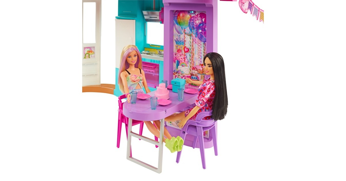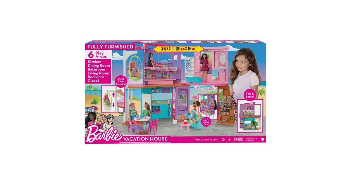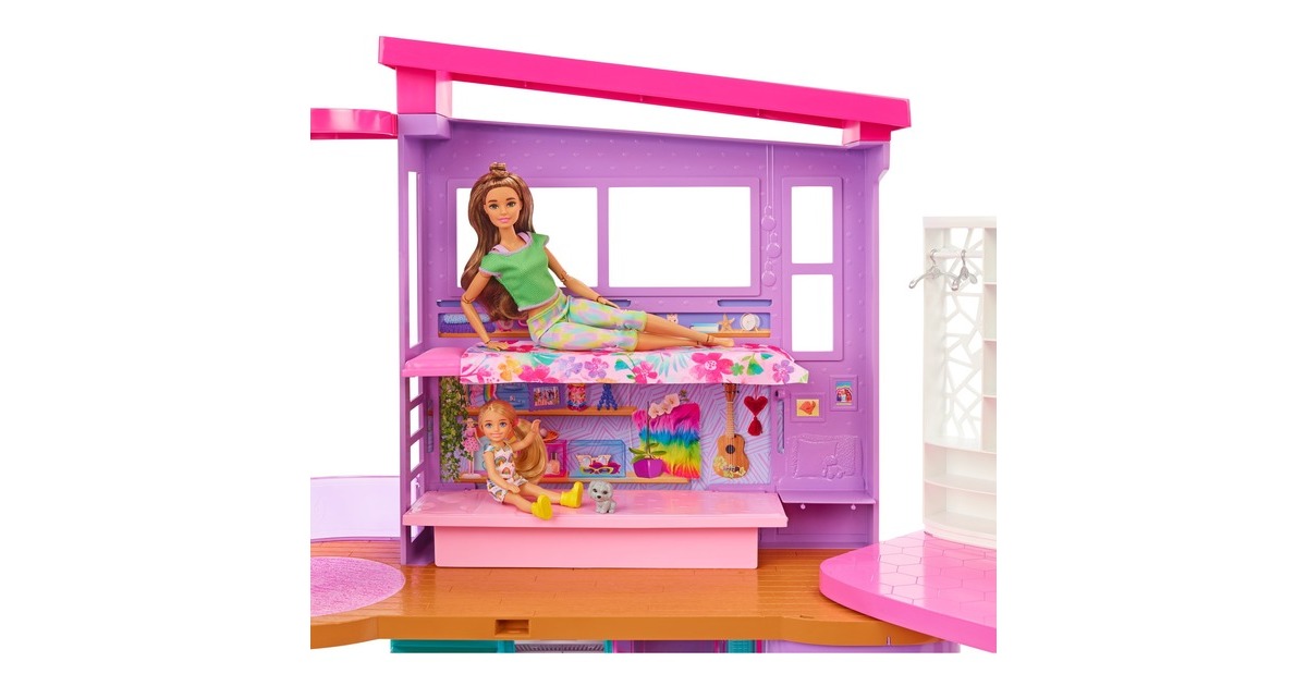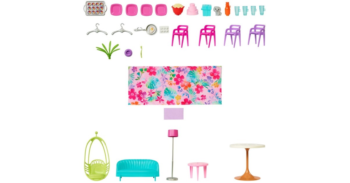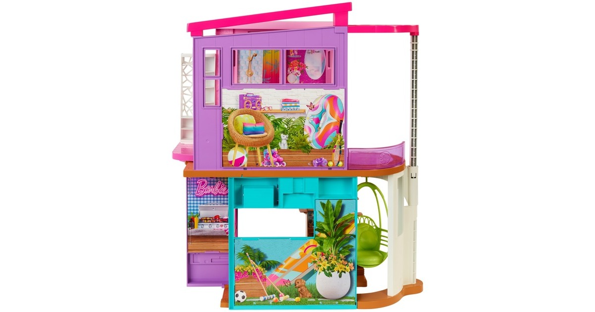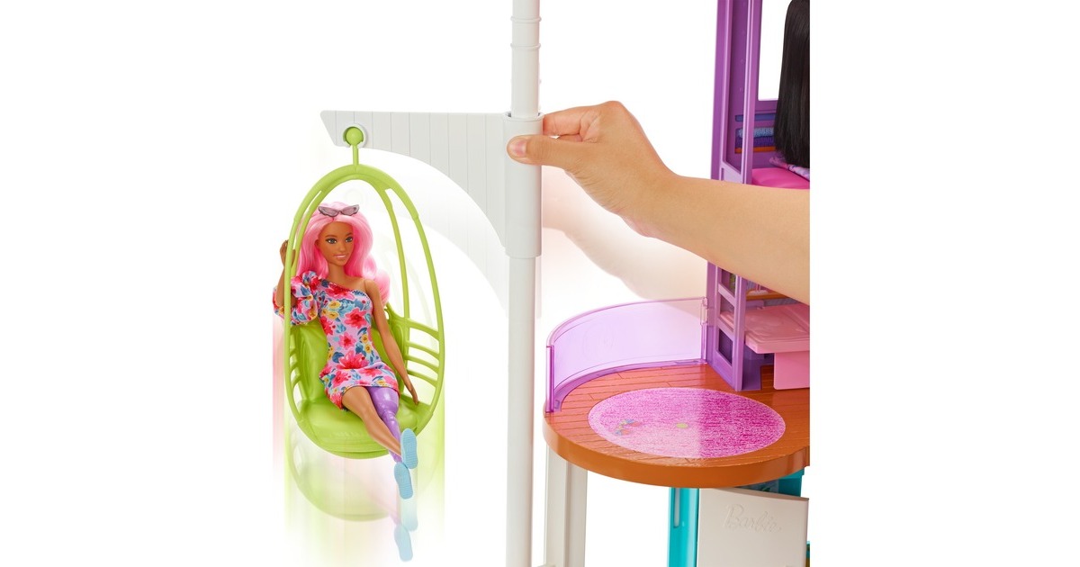 Mit diesem Spielset können Kinder ihren Traumurlaub nachspielen. Wer seine Vorstellungskraft in dieses zweistöckige Barbie-Puppenhaus versetzt, kann endlose Spielmöglichkeiten entdecken. Es bietet sechs Spielbereiche, darunter ein Schlafzimmer, ein Badezimmer, eine Küche, ein Esszimmer, ein Wohnzimmer und einen Schrank. Mit diesem Barbie-Haus öffnet sich die Tür zu vielen lustigen Geschichten dank seines modernen, stilvollen Designs und seiner coolen Eigenschaften: etwa einem Schaukelstuhl, der zugleich ein Aufzug ist, und einer Wand, die sich auf und ab bewegt, um den richtigen Ort für einen Filmabend oder eine Geburtstagsparty zu schaffen. Mit den über 30 Teilen, darunter ein Hündchen, witzige Möbel und weitere Zubehörteile, ist dieses Spielset ein tolles Geschenk für Kinder ab 3 Jahren.Art.-Nr.: 1846659