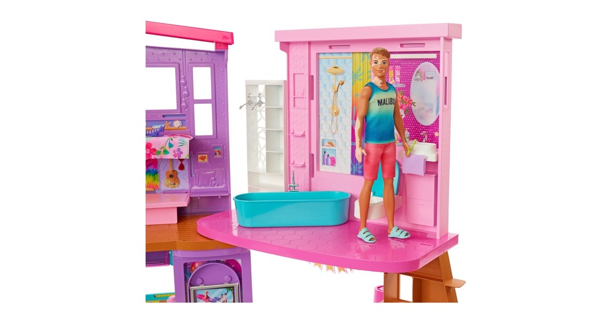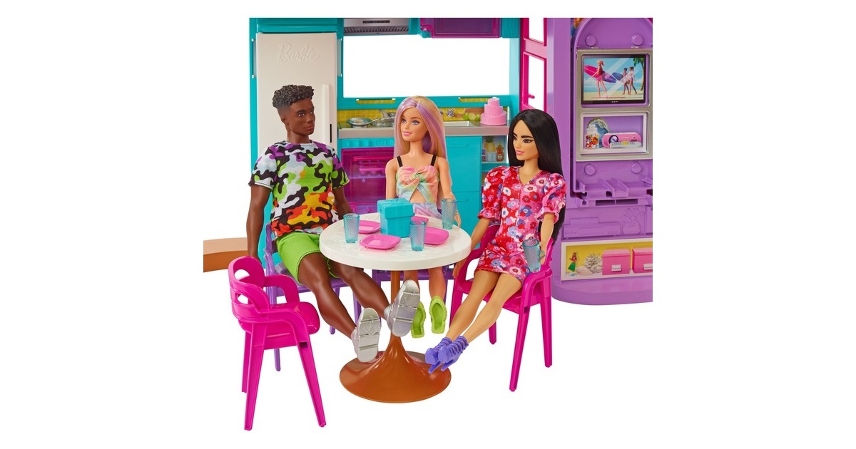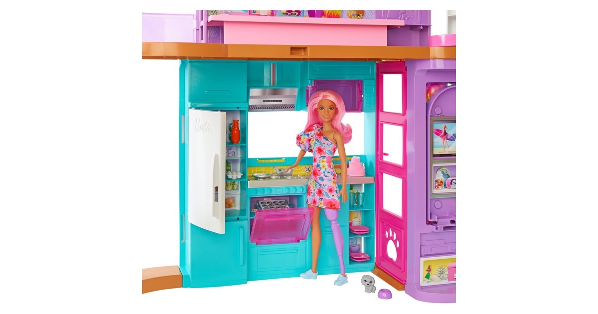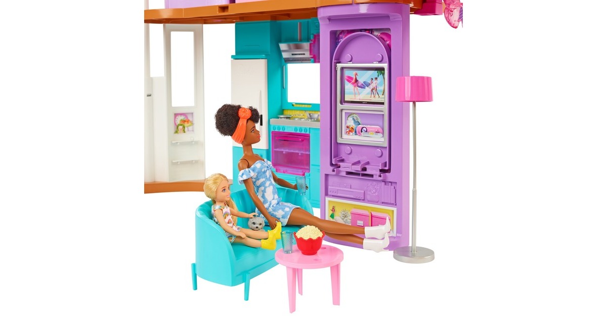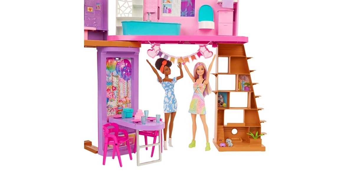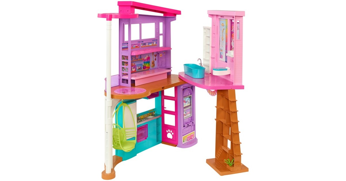 Mit diesem Spielset können Kinder ihren Traumurlaub nachspielen. Wer seine Vorstellungskraft in dieses zweistöckige Barbie-Puppenhaus versetzt, kann endlose Spielmöglichkeiten entdecken. Es bietet sechs Spielbereiche, darunter ein Schlafzimmer, ein Badezimmer, eine Küche, ein Esszimmer, ein Wohnzimmer und einen Schrank. Mit diesem Barbie-Haus öffnet sich die Tür zu vielen lustigen Geschichten dank seines modernen, stilvollen Designs und seiner coolen Eigenschaften: etwa einem Schaukelstuhl, der zugleich ein Aufzug ist, und einer Wand, die sich auf und ab bewegt, um den richtigen Ort für einen Filmabend oder eine Geburtstagsparty zu schaffen. Mit den über 30 Teilen, darunter ein Hündchen, witzige Möbel und weitere Zubehörteile, ist dieses Spielset ein tolles Geschenk für Kinder ab 3 Jahren.Art.-Nr.: 1846659