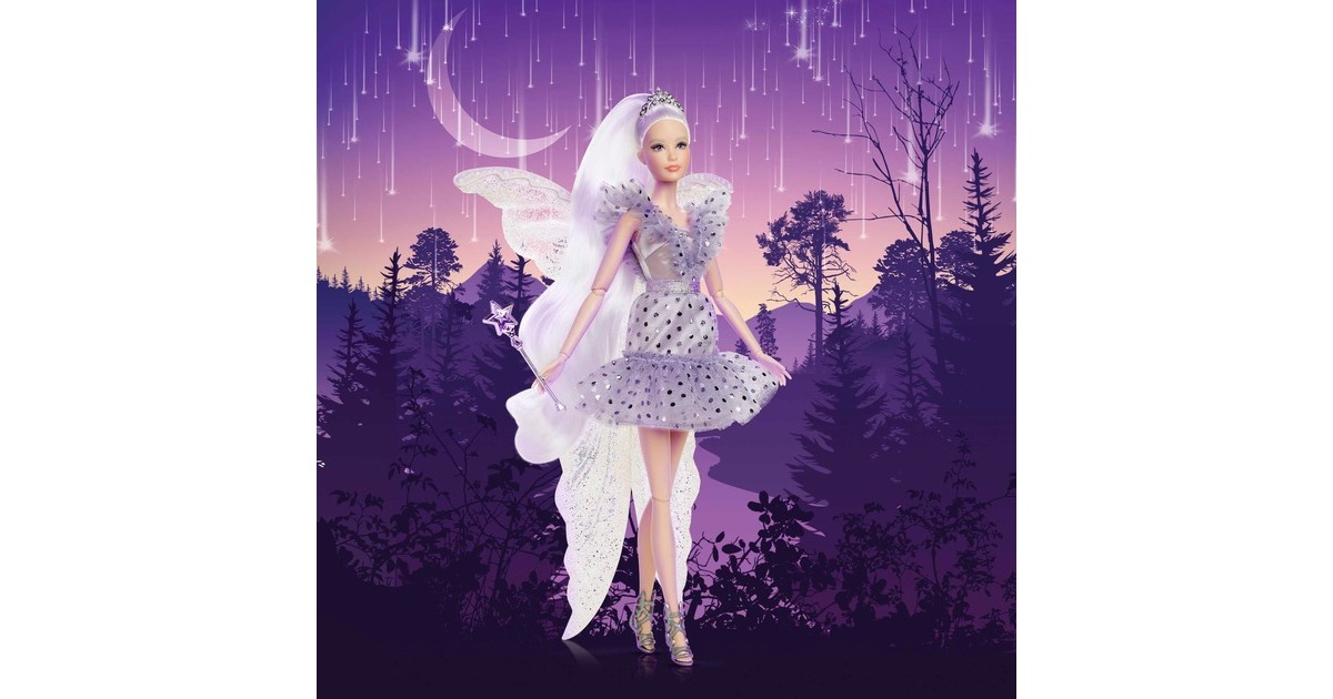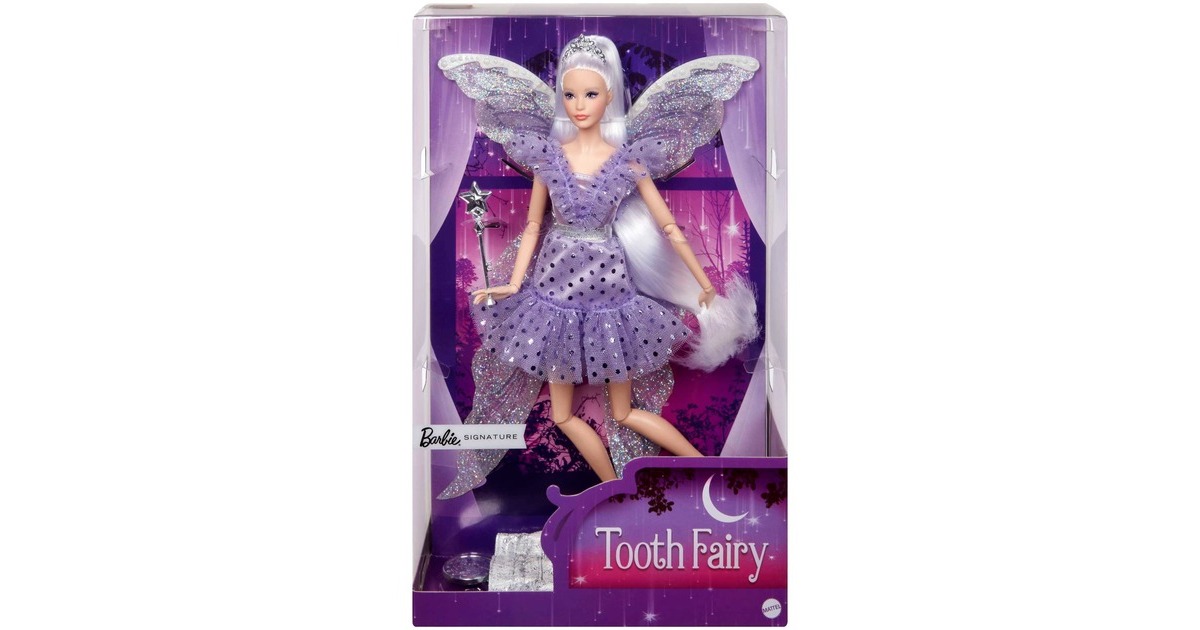 Diese Barbie-Sammlerpuppe ist ein magischer Meilenstein. Die Zahnfee überzeugt mit fantastischen Look und Zubehör: Sie trägt ein hübsches, Kleid in blau und lila, mit fließenden Rüschen, funkelnden Tupfen und perlenbesetztem Gürtel. Ihr Look wird von schimmernden Feenflügeln, einem silbrigen Zauberstab und einem mit Edelsteinen versehenen Diadem vervollständigt. Mit einem schimmernden Beutel voll silbriger Münzen und einer Verpackung mit Platz für eine persönliche Nachricht ist diese Puppe ein tolles Geschenk.Art.-Nr.: 100011062