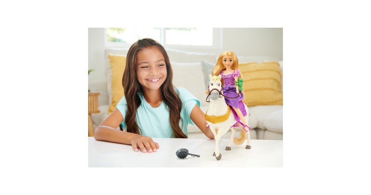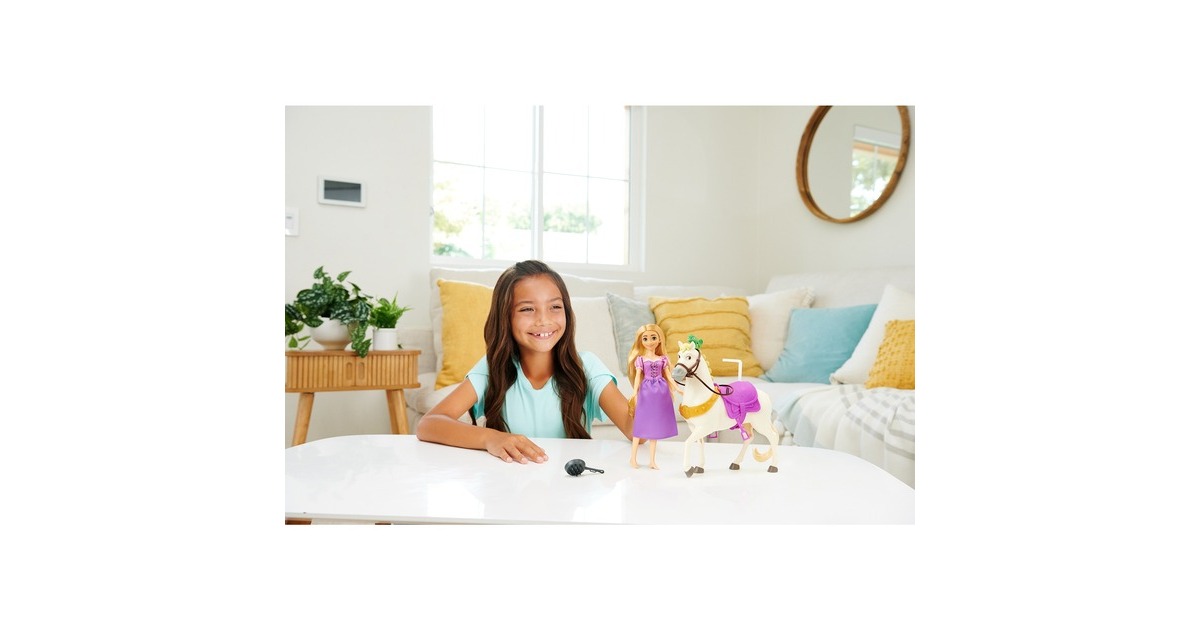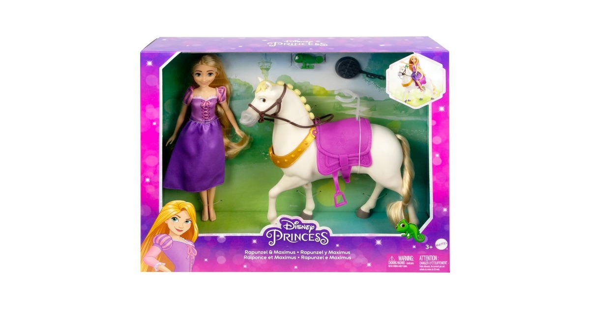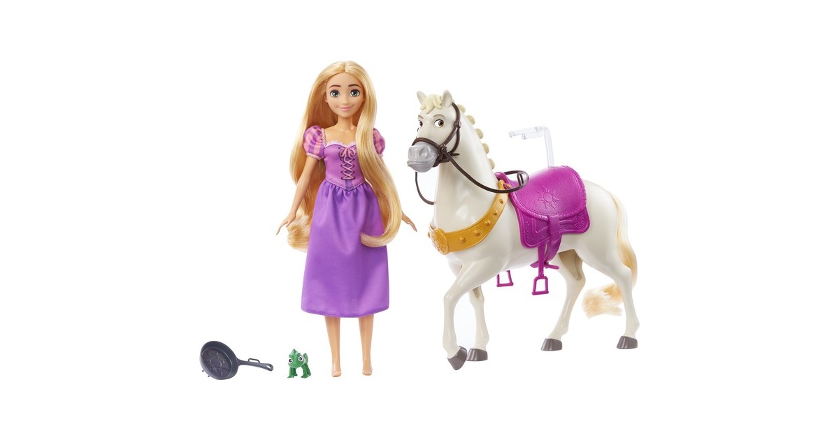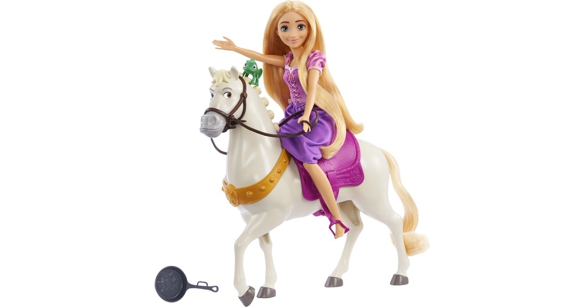 Diese Rapunzel-Modepuppe, welche durch die lebhafte und kreative Prinzessin aus Disney‘s Rapunzel inspiriert wurde, ist bereit für Abenteuer mit ihrem treuen Pferd Maximus. Mit einem Sattel und Zaumzeug für Maximus und den biegsamen Knien der Rapunzel-Puppe sind die beiden bereit, gemeinsame durchs Königreich zu reiten. Die Pascal-Figur kann auf Maximus' Mähne oder auf Rapunzels Arm gesteckt werden und so am Spaß teilhaben.Art.-Nr.: 1889899