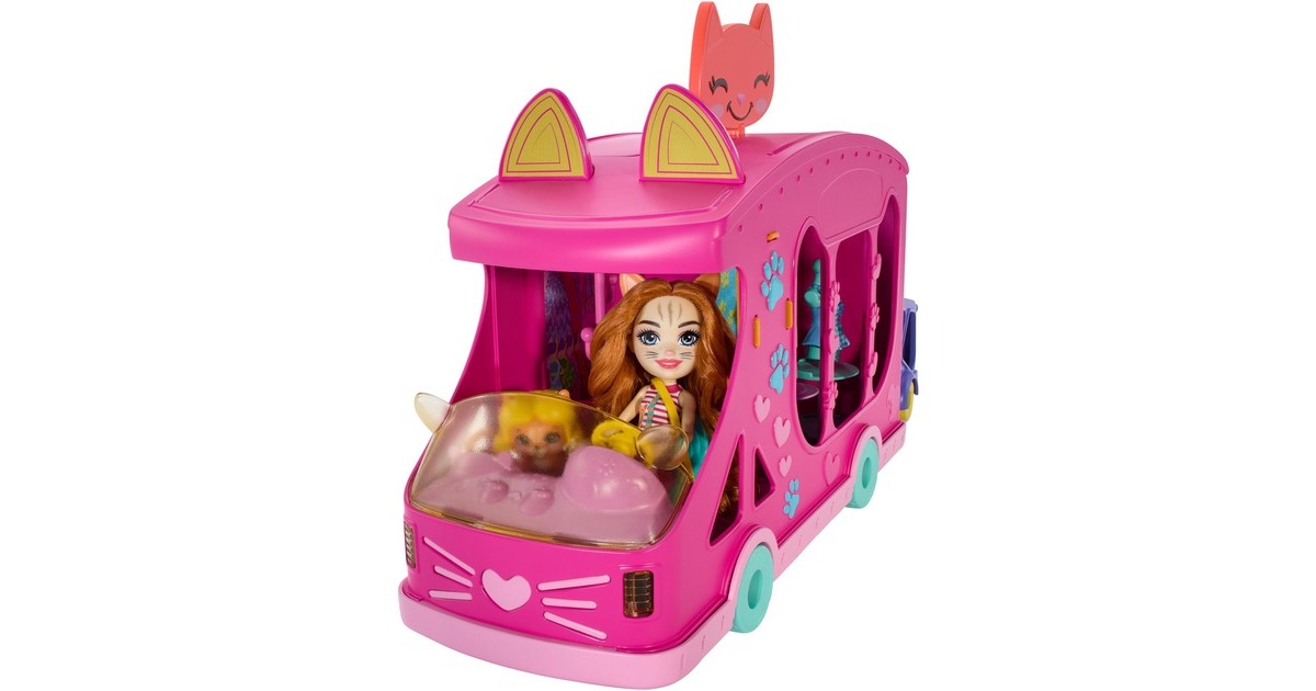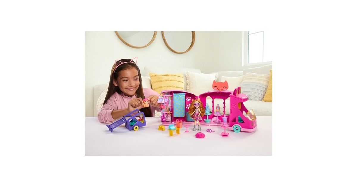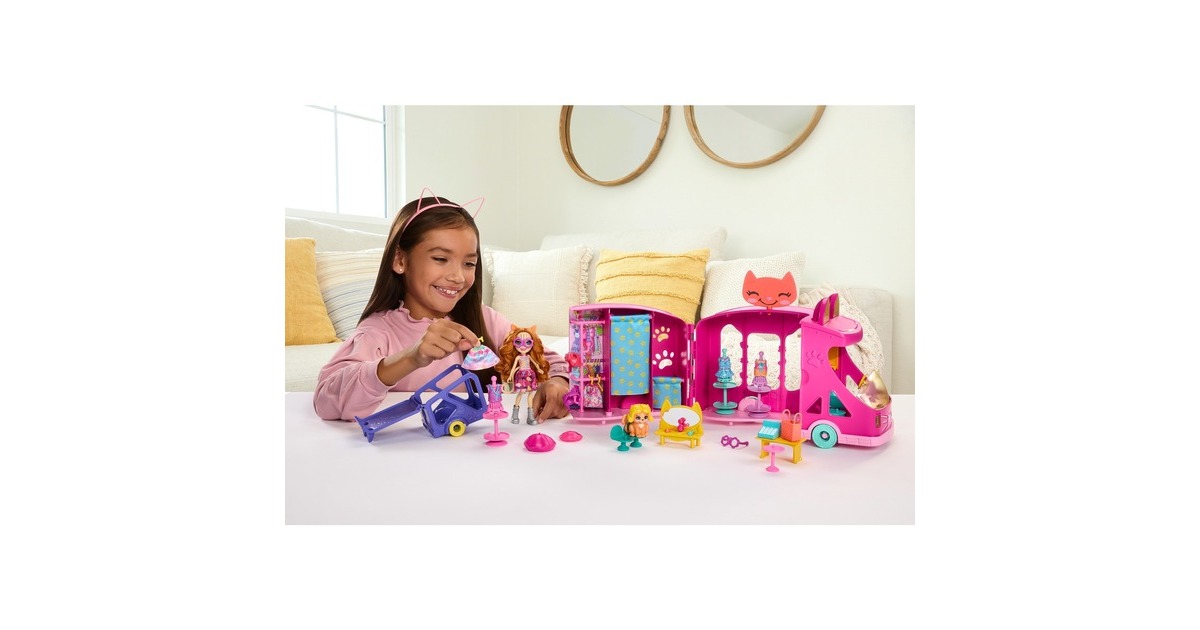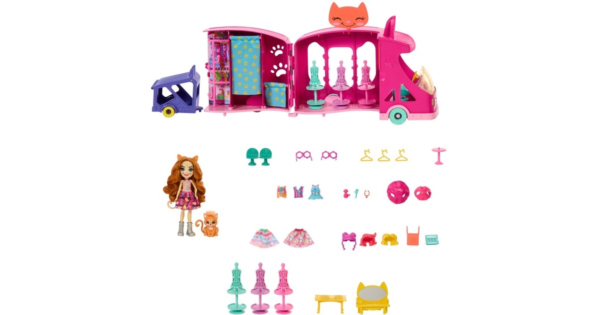Die Enchantimals und ihre Tierfreunde schmeißen eine Glam-Party und alle sind eingeladen! Was für eine tolle Modenschau, wenn der Modewagen mit einer mitgelieferten, 15 Zentimeter großen Enchantimals-Puppe am Steuer in die Stadt fährt. Wird der Wagen geöffnet, kommt alles zum Vorschein, was für eine richtige Modenschau benötigt wird: Zusätzliche Outfits, Modepuppen, ein Ankleideraum, ein Tisch und vieles mehr. Insgesamt sind mehr als 25 Zubehörteile für tollen Modespaß enthalten. Es gibt sogar einen Anhänger, in dem der mitgelieferte beste Tierfreund mitreisen kann.