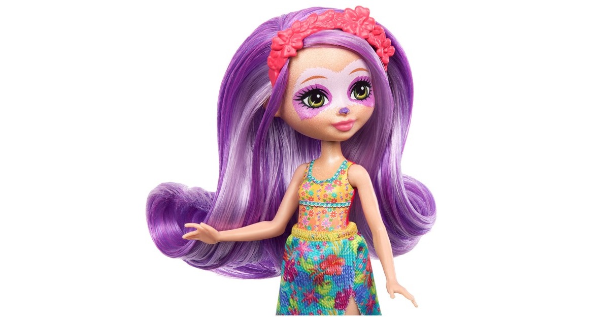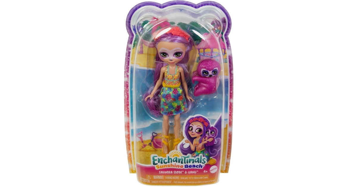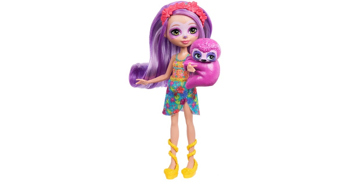 Die Mattel-Puppen der Reihe Enchantimals sind liebenswerte Charaktere, die mit ihren Tierfreunden auf ganz besondere Weise verbunden sind. Die Puppen sind jeweils 15,2 Zentimeter groß und werden von einem niedlichen Tier begleitet. Das Faultiermädchen Sabindra Sloth trägt ein Blumen-Haarband, einen abnehmbaren Rock und Schuhe. Ihr Tierfreund Hang lässt sich an ihrem Arm befestigen.Art.-Nr.: 100025926
