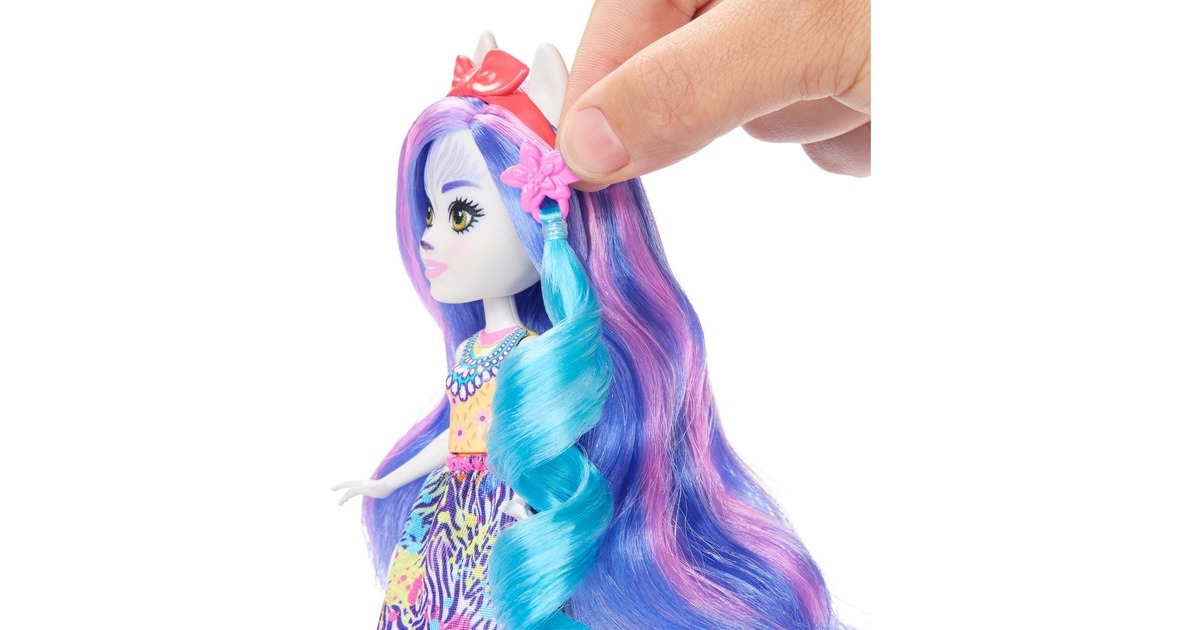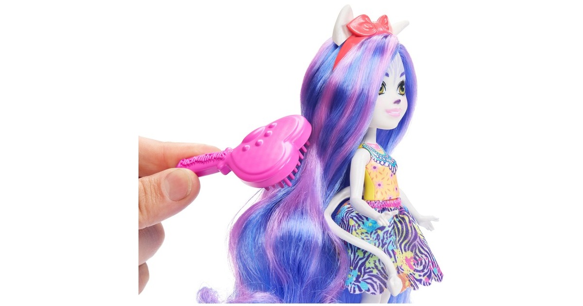 Hier kommen die Enchantimals! Diese Deluxe Hair Puppen sehen fantastisch aus und haben das Zeug, auf der Glam Party auf dem Laufsteg als Superstars zu glänzen! Die 15 cm große Zemirah Zebra-Puppe mit ihrem langen, glamourösen Haar ist bei allen beliebt. Sie besitzt fünf Haarspiel-Accessoires und wird von ihrer besten Tierfreundin Grainy begleitet.Art.-Nr.: 1918970
