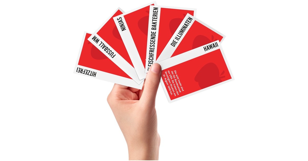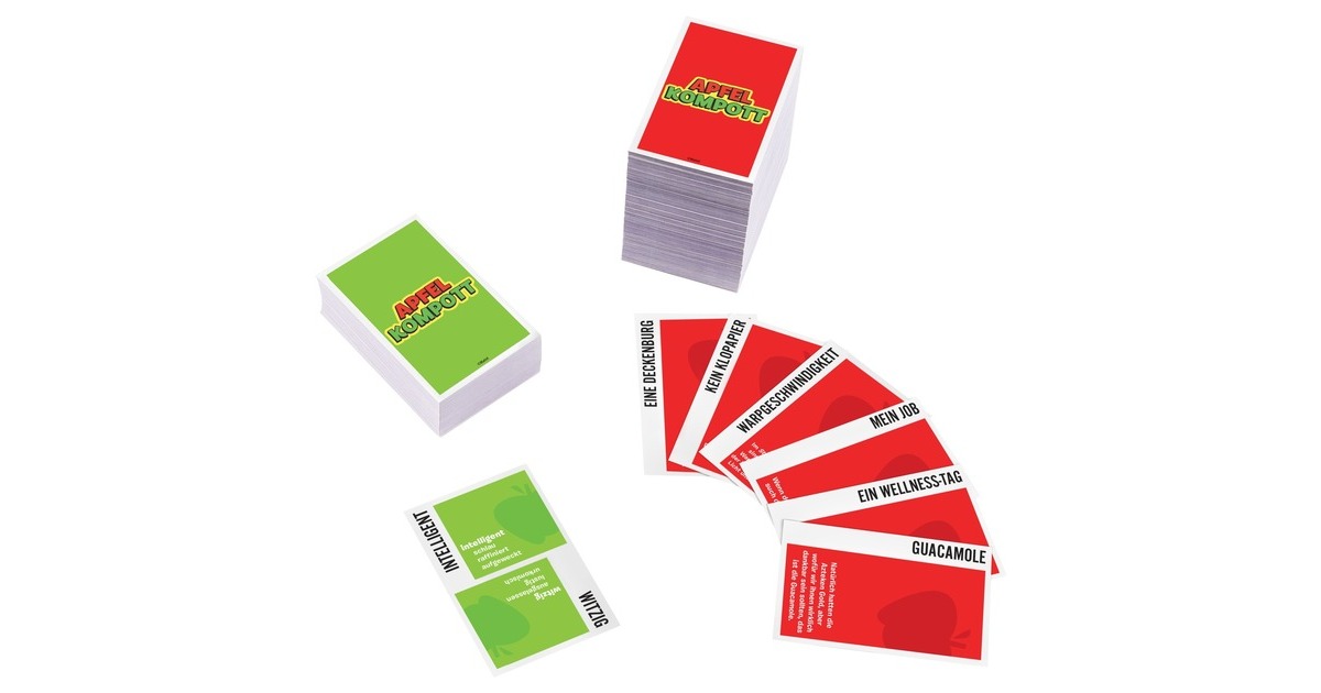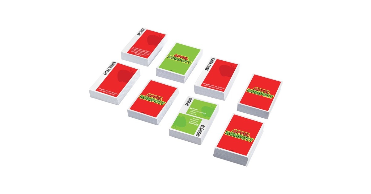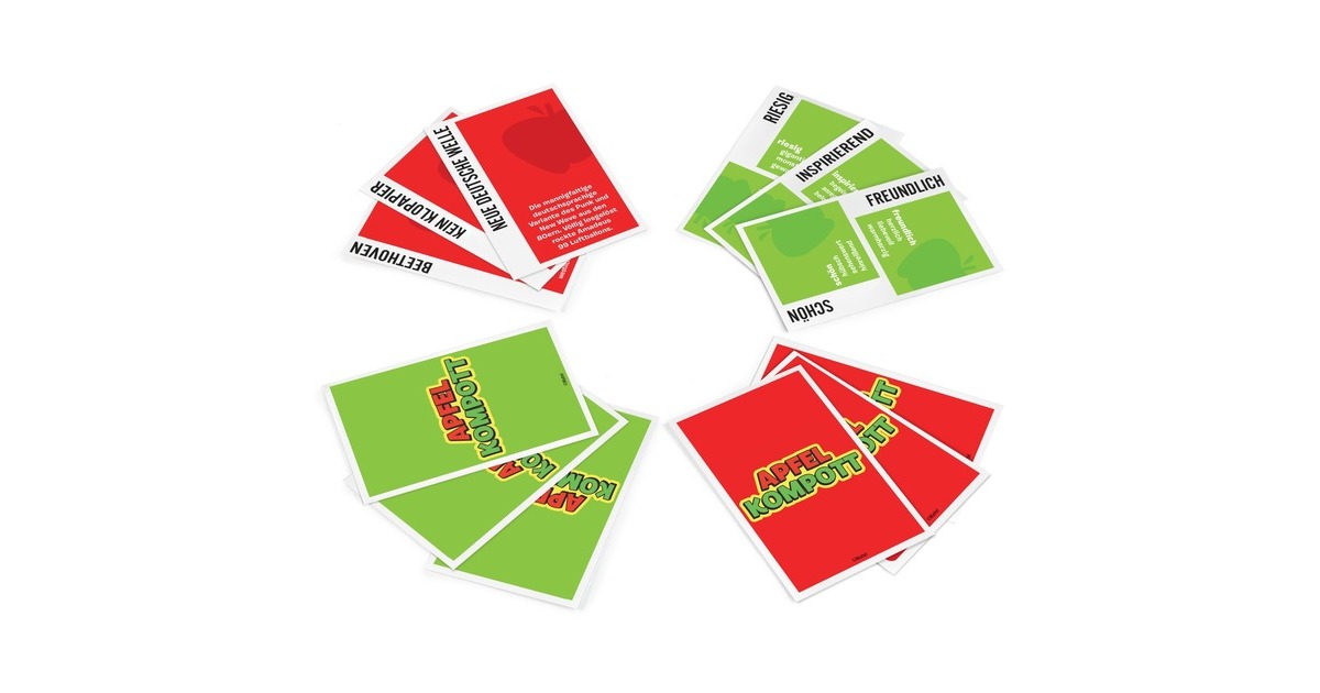 Das Spiel mit den verrückten Kombinationen! Das Apfelkompott Partyspiel kommt in einer Metalldose zum Sammeln und enthält 1000 Karten! Es ist das total verrückte, preisgekrönte Partyspiel, das vier bis zehn Spielern jede Menge Spielspaß bringt! Das Spiel ist so leicht zu lernen, wie Äpfel mit Äpfeln zu vergleichen. Einfach aufmachen, Karten verteilen und schon geht's los! Jeder Spieler wählt eine seiner Handkarten aus, die seiner Meinung nach am besten zu dem Begriff der vom Schiedsrichter aufgedeckten Karte passt. Der Spieler, für dessen Karte sich der Schiedsrichter entscheidet, gewinnt die Runde. Und das Gute daran? JEDER ist mal Schiedsrichter! Jede Runde ist voll überraschender und total verrückter Vergleiche zwischen Leuten, Orten, Dingen oder Ereignissen. Rasant, wild und erfrischend anders! Apfelkompott ist perfekt für die Familie und den Freundeskreis! Das Partyspiel mit über 1000 Karten kommt in einer Metalldose. Abweichungen in Farbe und Gestaltung vorbehalten.Art.-Nr.: 1657946