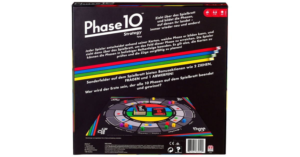 Von den Machern von UNO gibt es jetzt ein neues Kartenspiel! Ziel des Spiels ist es, als Erster 10 unterschiedliche Phasen abzuschließen: zwei Drillinge, eine Siebenerfolge, sieben Karten derselben Farbe usw. Das Besondere ist, dass in jeder Spielrunde eine bestimmte Phase abgeschlossen werden muss. Wer eine Phase abschließt, darf mit der nächsten weitermachen. Alle anderen müssen einen erneuten Versuch starten.Art.-Nr.: 1453624