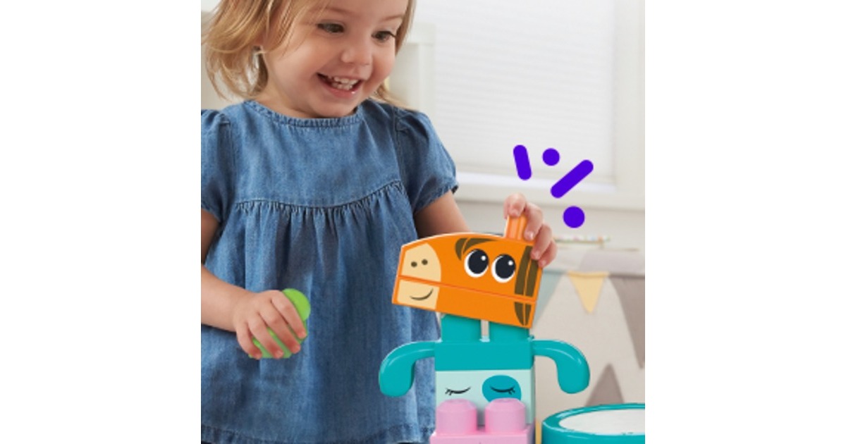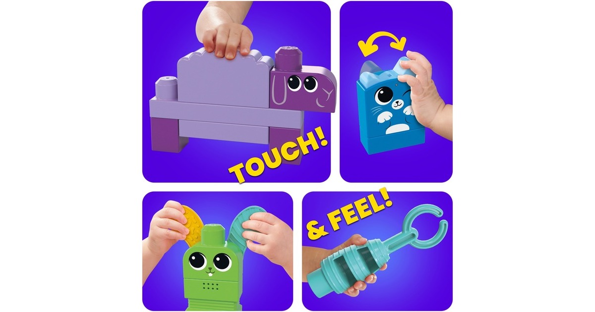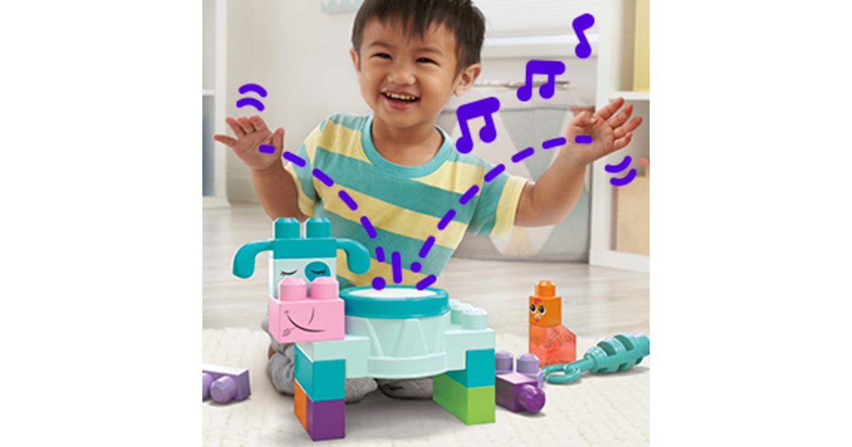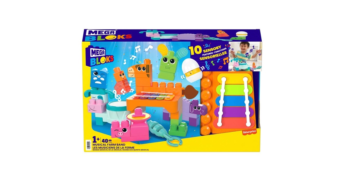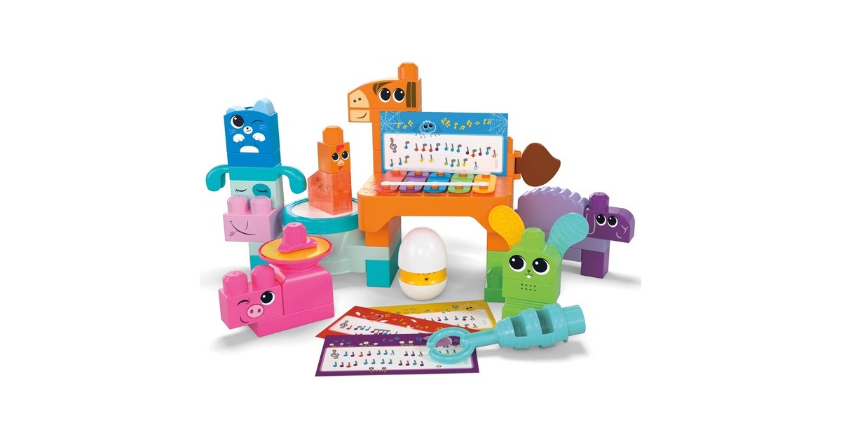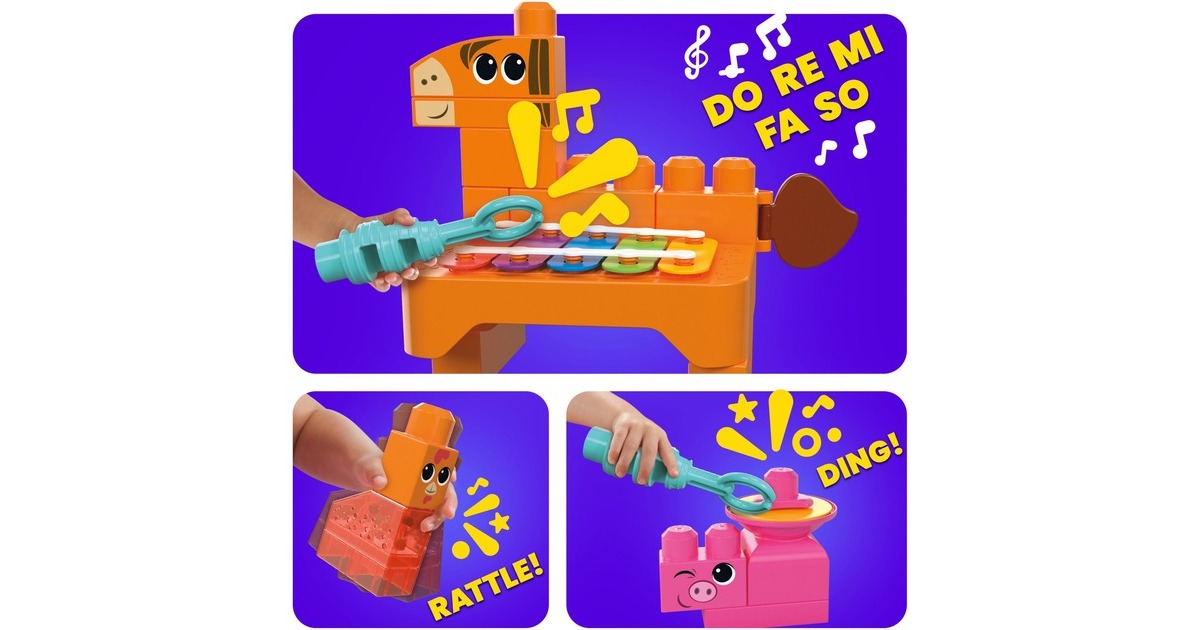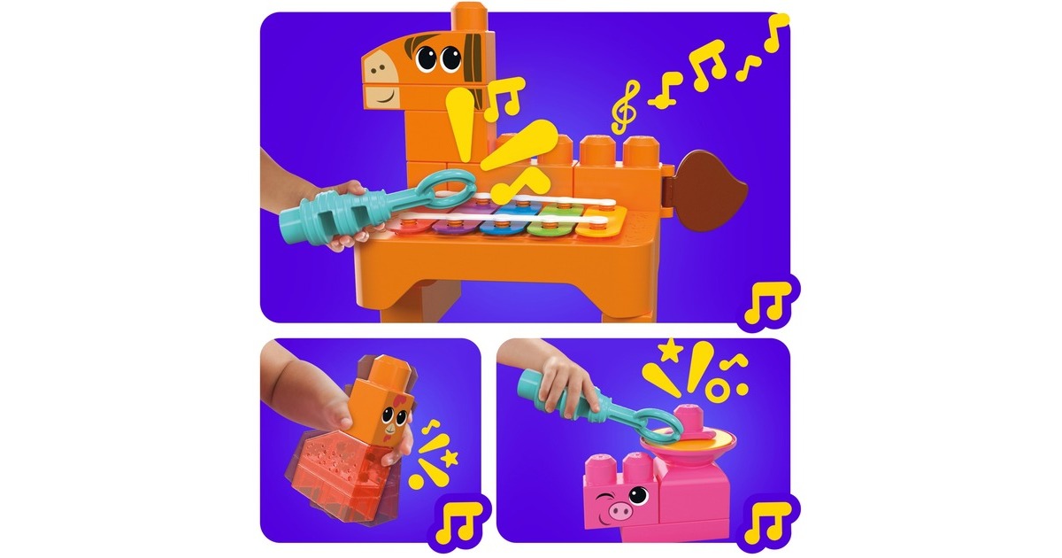 Dieses sensorische Bauset aus der Serie MEGA BLOKS fördert die Entwicklung visueller und akustischer Wahrnehmung. Kinder ab 12 Monaten können eine komplette Band mit Pferde-Xylophon, Kuh-Schlagzeug, Schweinchen-Schelle, Hühner-Rassel, Schaf-Guiro, Klacker-Katze, Hasen-Quietscher und einer Eier-Kastagnette bauen. Das Set umfasst 45 große Bauteile, 6 Notenblätter und 10 Sensorik-Elemente.Art.-Nr.: 1919348