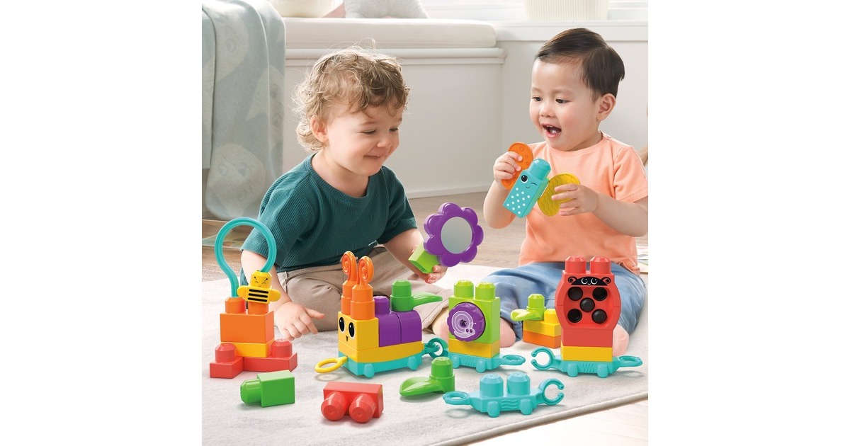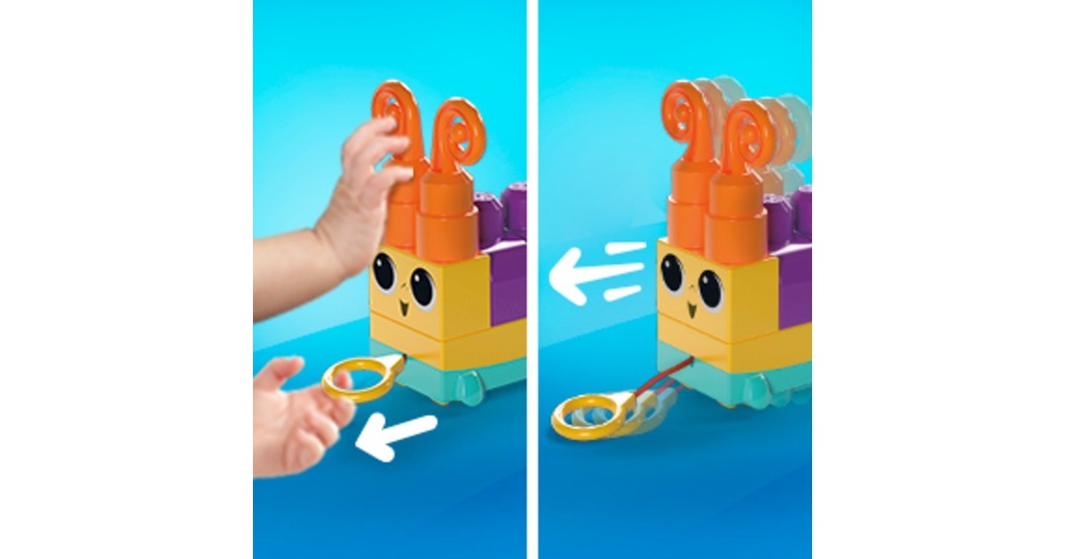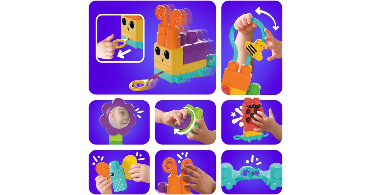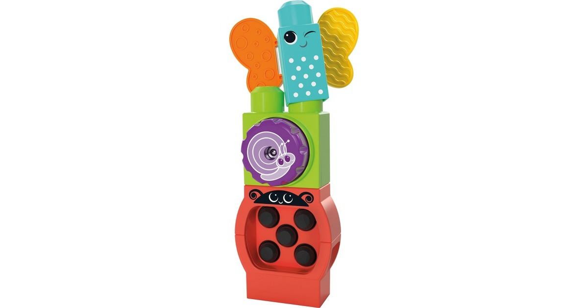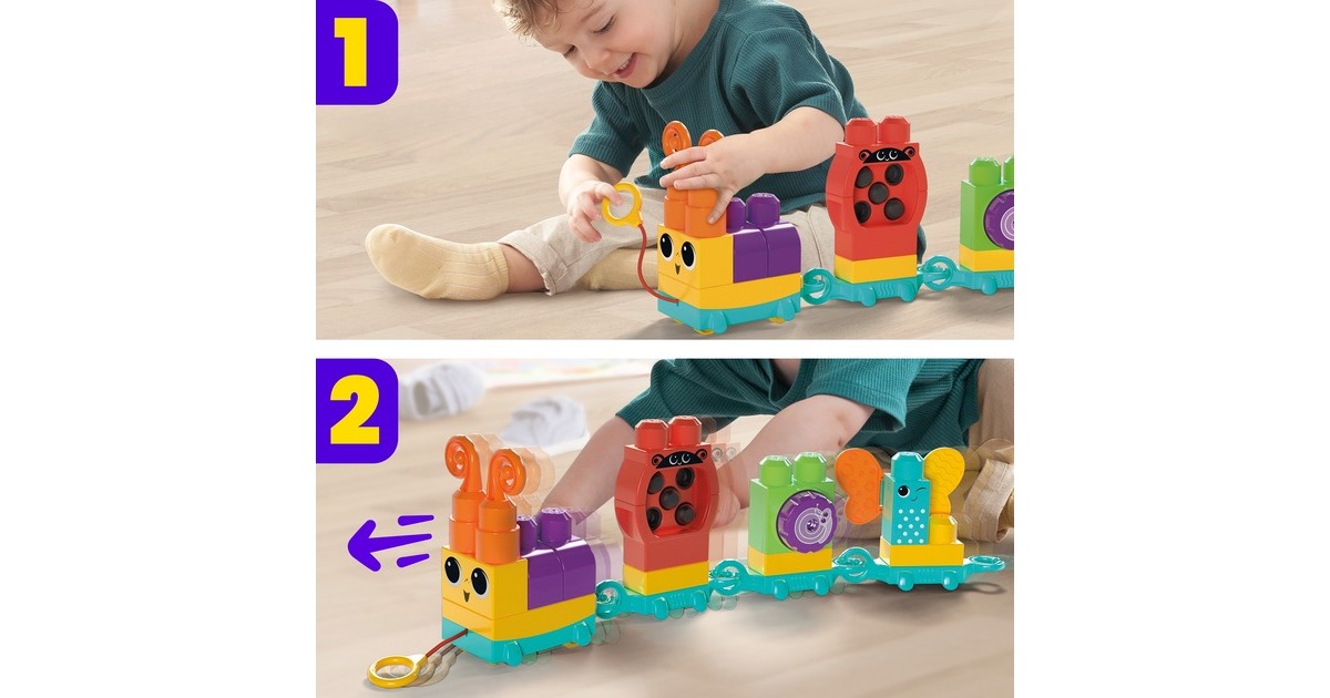 Kleine Baumeister haben mit diesem niedlichen Raupenzug viel Spaß beim Krabbeln und Stehen. Kleinkinder können den beweglichen Raupenzug mit Kettenbausteinen und Schnur zusammenbauen, um ihn dann in Bewegung zu setzen. Noch ein Schmetterling in Form eines Stapelblocks, eine Schnecke zum Drehen und Stecken sowie ein Schmetterling mit strukturierten Flügeln oben auf dem Rücken der Raupe platziert und los geht das Abenteuer. Eine Blume mit Spiegel, strukturierte Antennen und ein Bienenbaustein mit Perlen laden zum Erkunden ein.Art.-Nr.: 1888819