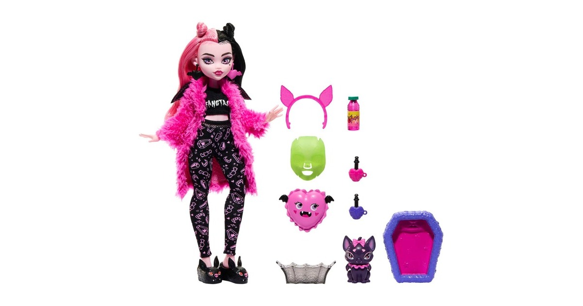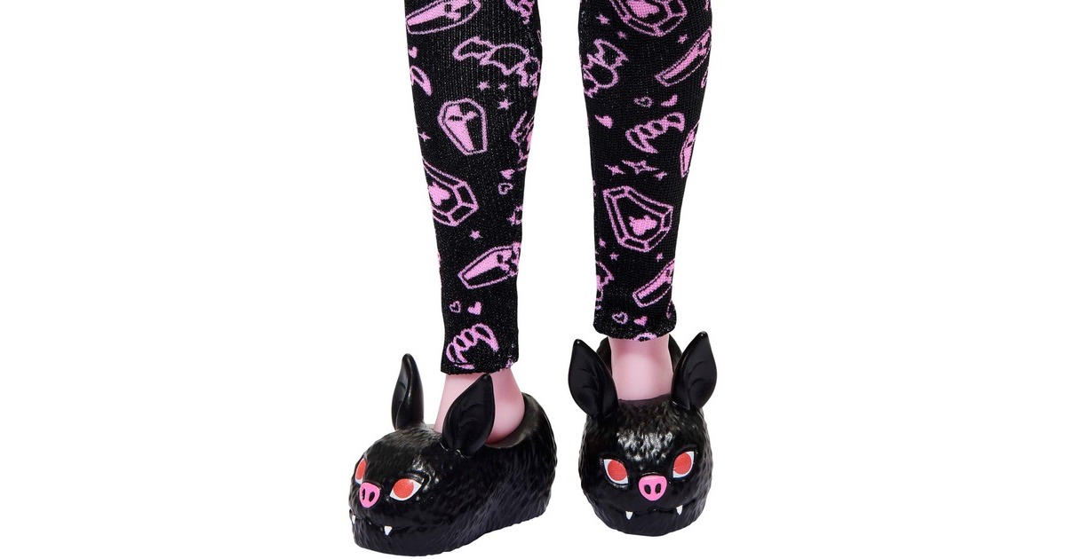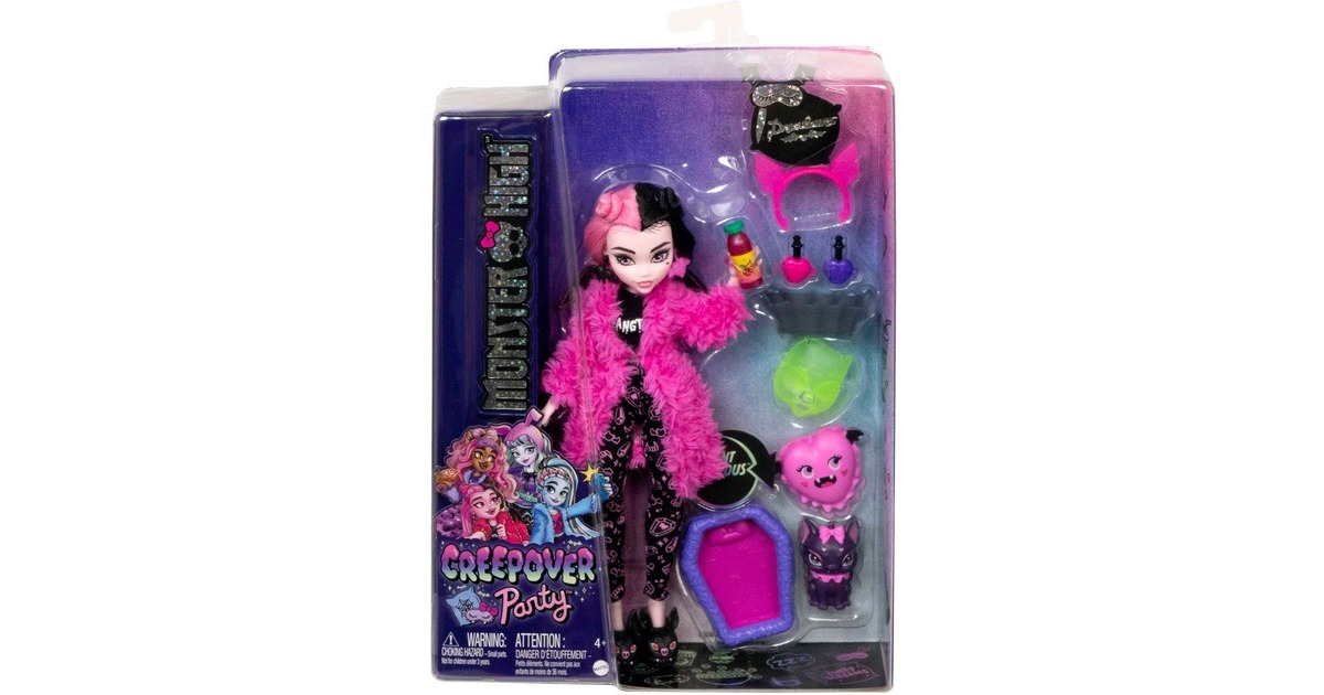 Auch auf der Monster High stehen Pyama-Parties hoch im Kurs - und die Puppen der Reihe Creepover von Mattel sind bestens dafür gerüstet! Jede Puppe bringt einen coolen Grusel-Look, Zubehör für die Party und ihr Haustier mit. Draculaura trägt eine zottelig-kuschelige Jacke über einem kurzen T-Shirt und bedruckte Leggings mit Netzstrumpfhosendetails. Space Buns und Ohrringe runden ihren Look mit pinkem Haareif und niedlichen Fledermaus-Hausschuhen ab. Ihre Haustierfledermaus Count Fabulous hat ihr eigenes kleines Bett in Sargform mit dabei.Art.-Nr.: 100025895