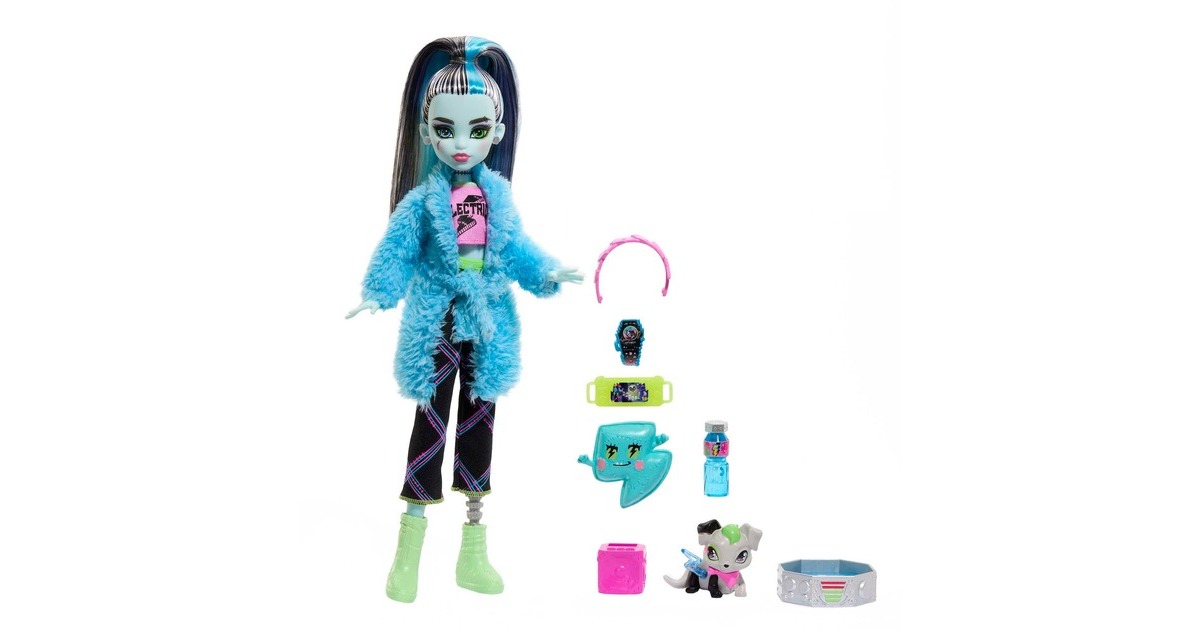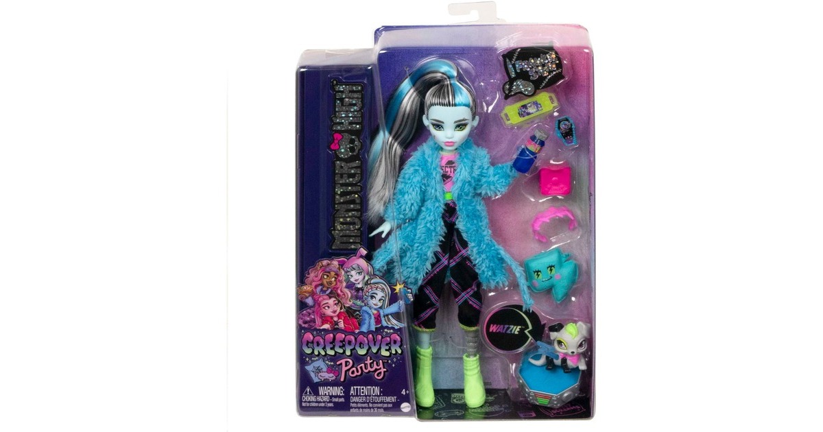 Auch auf der Monster High stehen Pyama-Parties hoch im Kurs - und die Puppen der Reihe Creepover von Mattel sind bestens dafür gerüstet! Jede Puppe bringt einen coolen Grusel-Look, Zubehör für die Party und ihr Haustier mit. Frankie trägt einen superweichen Hoodie, der ebenso kuschelig wie elektrisierend ist. Dazu trägt sie ein pinkes T-Shirt mit Aufdruck und karierte Cropped-Leggings. Ihr eleganter Pferdeschwanz mit blauen Strähnchen, die asymmetrischen grünen Stiefel und ihr Haarband mit Blitz-Details machen Frankie zum Hingucker auf jeder Party. Ihre Hund Watzie bringt sein eigenes Bett mit. Art.-Nr.: 100025900