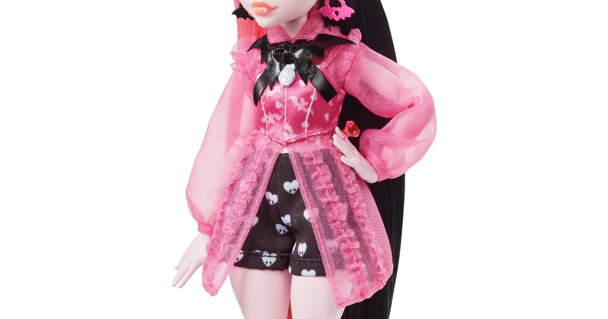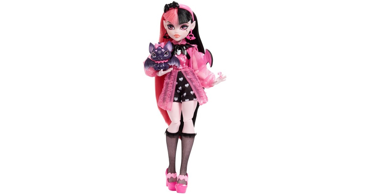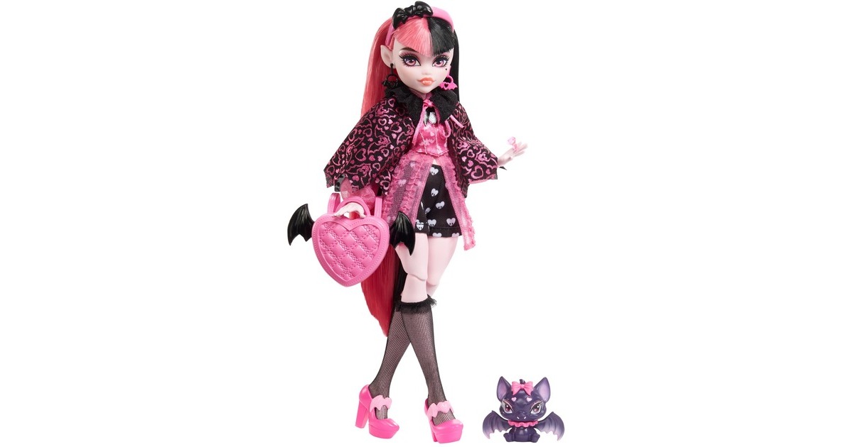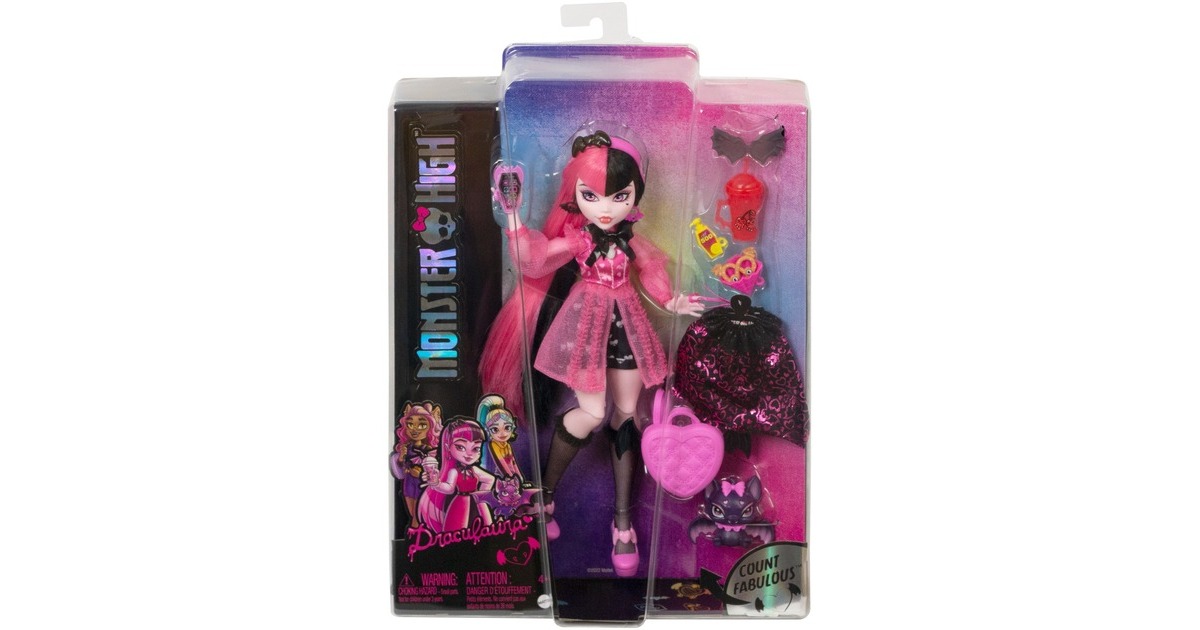 Die Schule hat wieder begonnen und die Ghule der Monster High tauchen in ihrem kreischtastischen Stil auf! Die Draculaura Puppe stolziert fantastisch gekleidet in Shorts mit Herzdruck und einer Vampir-Korsettbluse mit durchsichtigen Ärmeln durch die Gänge der Monster High. Ihr fabelhaft freakiger, vampirinspirierter Look ist komplett mit transparenten, gekräuselten Strümpfen, rosafarbenen Plateauschuhen, einem Stirnband und einer Sonnenbrille mit verrückten Details. Der Draculaura Puppen-Look erreicht das nächste Level mit einem gruselig-schicken Umhang und Zubehör. Und ihre gruselig-süße Haustierfledermaus, Count Fabulous, inspiriert zu gespenstischem Geschichtenerzählen!Art.-Nr.: 1918888