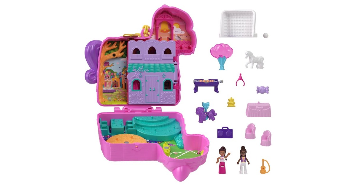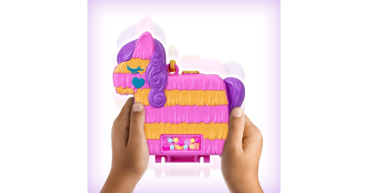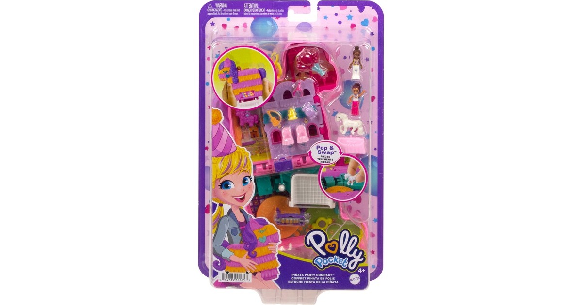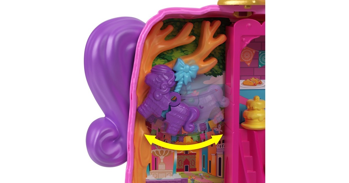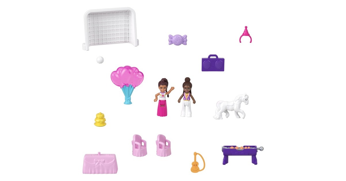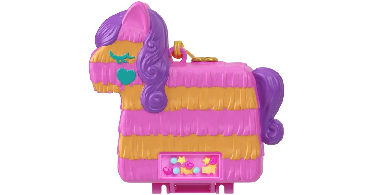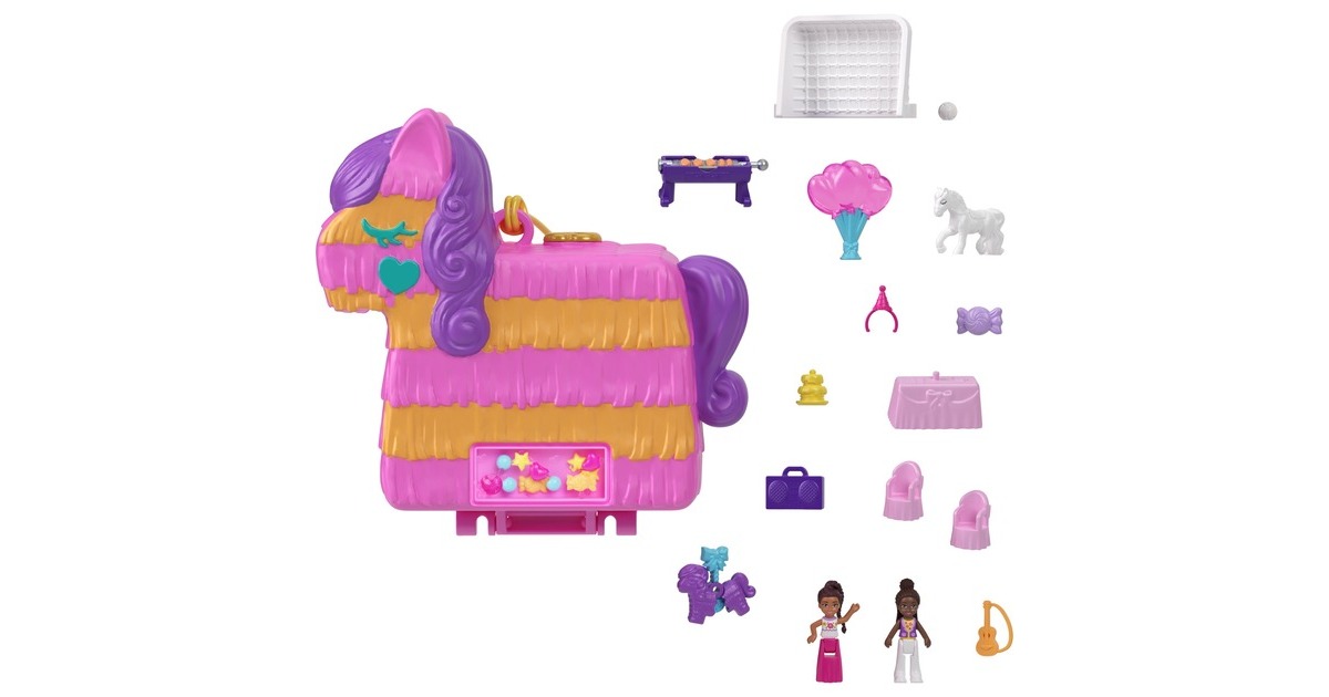 Dieses Party.Set aus der Serie Polly Pocket ist ein tolles Spielzeug für unterwegs mit vielen niedlichen Details. Auf der Außenseite der Schatulle befindet sich ein Pferd. Die aufklappbare Schatulle hat ein Handgelenkband und ein Glitzer-Element zum Schütteln. Im Inneren befinden sich zwei kleine Puppen, fünf bewegliche Spielelemente und 13 Accessoires - darunter ein Pferd, ein tragbares Radio und ein Grill mit wendbarem Essen. Die Türen zur Party lassen sich öffnen, in der Piñata befinden sich Süßigkeiten. Außerdem gibt es eine sich drehende Tanzfläche und ein Fußballtor mit Ball. Art.-Nr.: 1889201