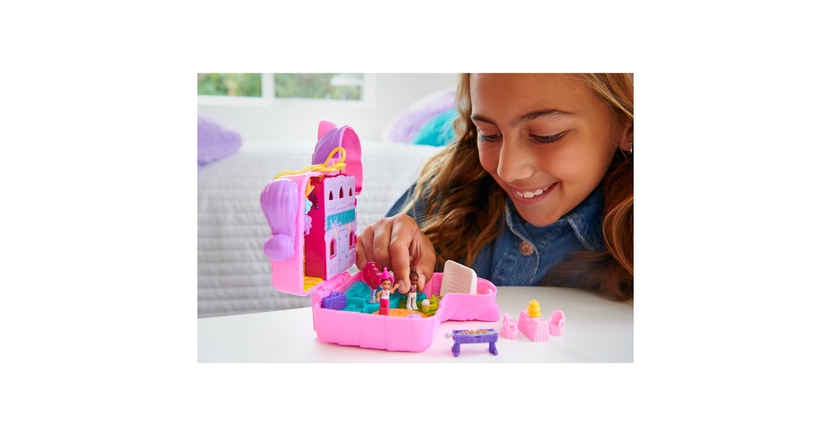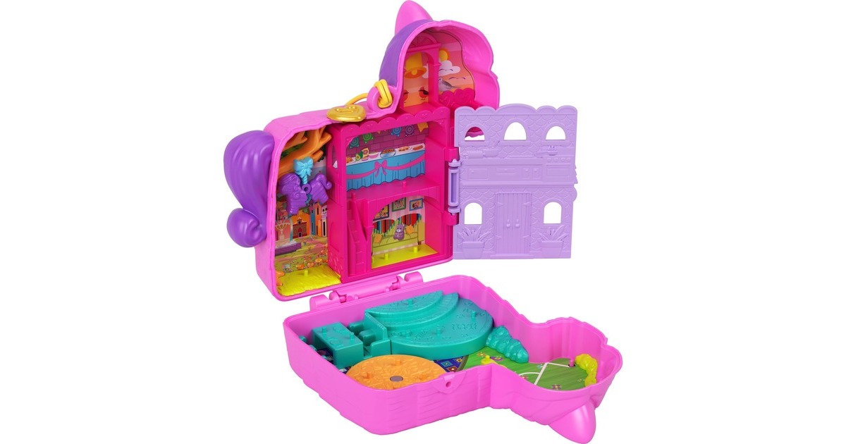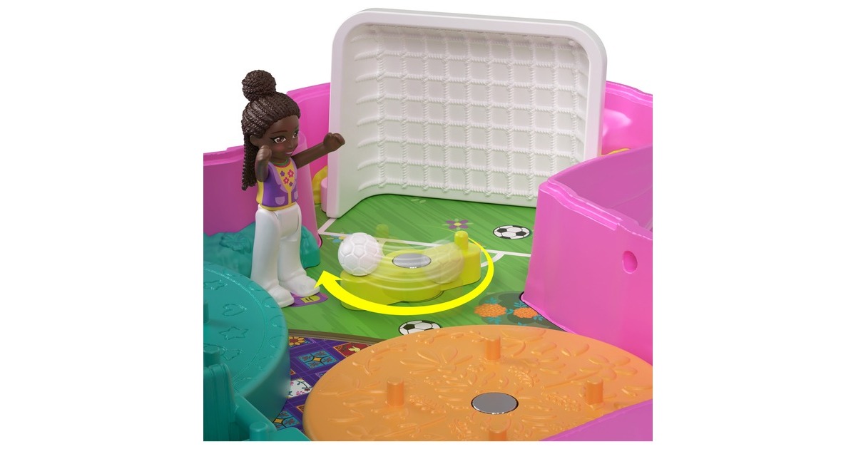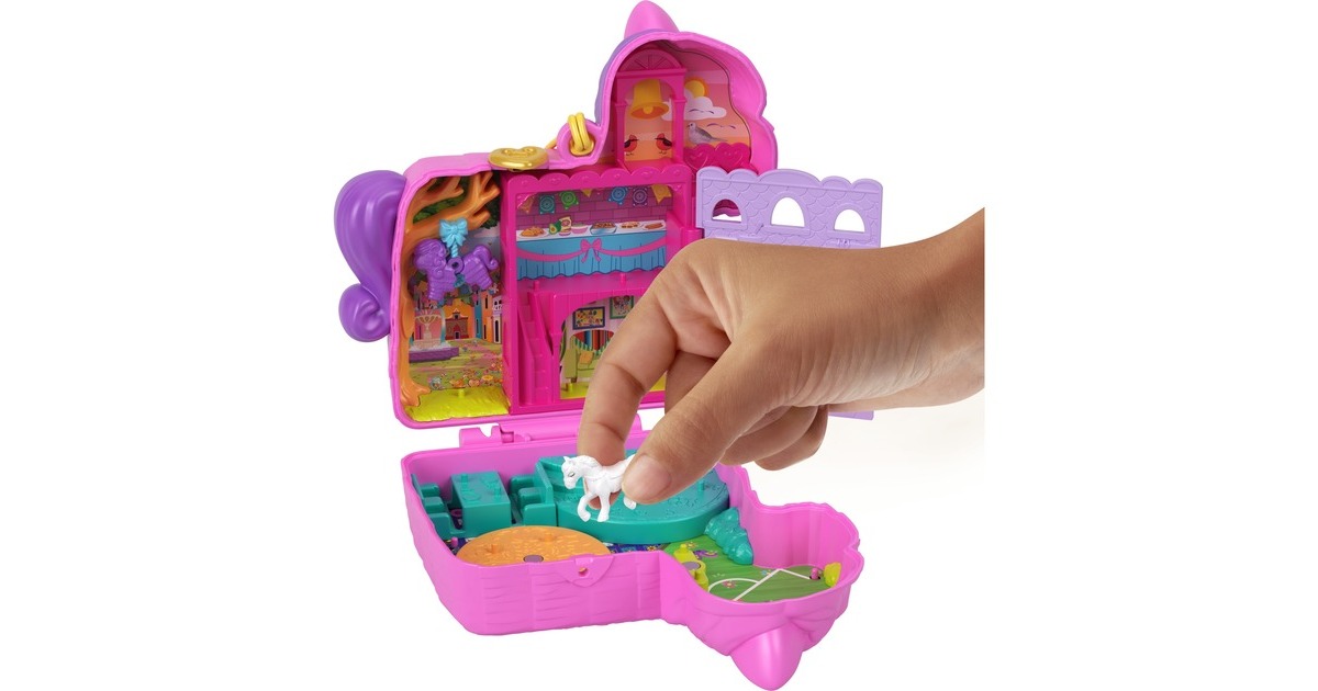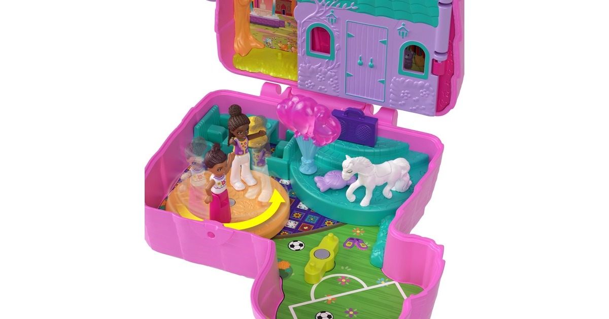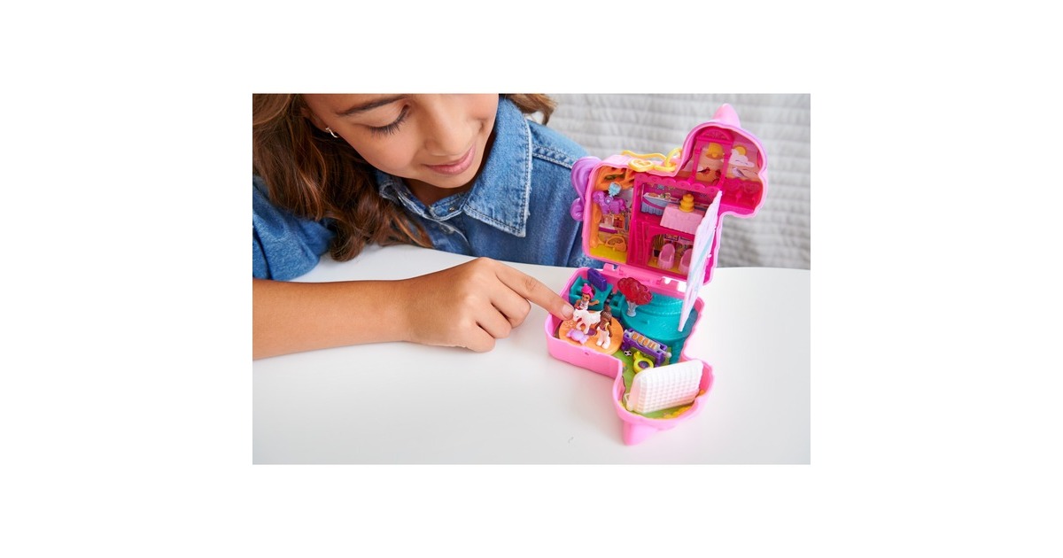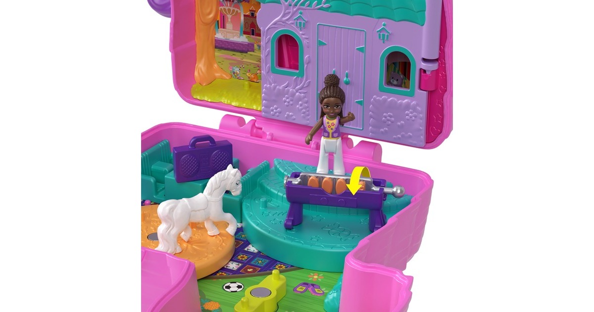 Dieses Party.Set aus der Serie Polly Pocket ist ein tolles Spielzeug für unterwegs mit vielen niedlichen Details. Auf der Außenseite der Schatulle befindet sich ein Pferd. Die aufklappbare Schatulle hat ein Handgelenkband und ein Glitzer-Element zum Schütteln. Im Inneren befinden sich zwei kleine Puppen, fünf bewegliche Spielelemente und 13 Accessoires - darunter ein Pferd, ein tragbares Radio und ein Grill mit wendbarem Essen. Die Türen zur Party lassen sich öffnen, in der Piñata befinden sich Süßigkeiten. Außerdem gibt es eine sich drehende Tanzfläche und ein Fußballtor mit Ball. Art.-Nr.: 1889201