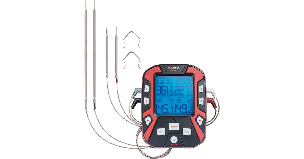 Das XR-50 Remote-Grill- und Smokerthermometer von Maverick bietet eine einfache Möglichkeit, das Fleisch beim Garen auf dem Grill oder im Smoker aus der Ferne zu überwachen. Der tragbare Empfänger hat eine Reichweite von bis zu 152,4 Metern, so kann man das Fleisch im Auge behalten, ohne direkt am Grill stehen zu müssen. Das XR-50 Remote-Grillthermometer wird mit vier Sonden geliefert und der Empfänger verfügt über vier separate Messwerte mit allen Informationen für jede Sonde. Ein integrierter Alarm signalisiert, wenn die gewünschte Temperatur erreicht ist. Jede Sonde hat auch die Option, High- und Low-Alarme für genaue Messwerte einzustellen, unabhängig davon, was gegrillt werden soll. Dieses kabellose Grillthermometer ist mit der modernen INSTA-SYNC®-Technologie ausgestattet so bietet es eine schnellere Verbindung, einfachere Programmierung und weniger Verbindungsabbrüche, sodass man sich keine Sorgen mehr um das Fleisch machen muss und die Mahlzeit genießen kann.Art.-Nr.: 1659236