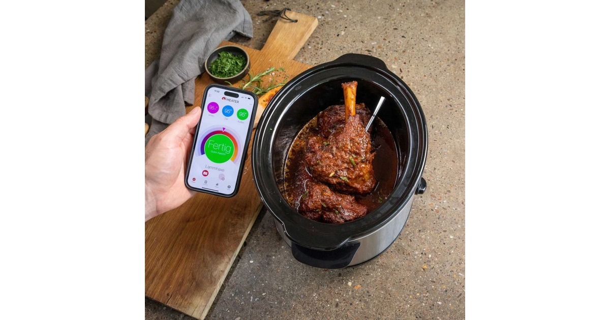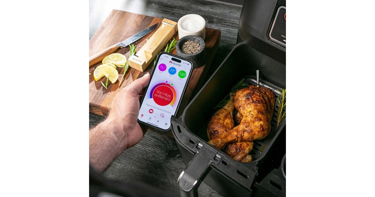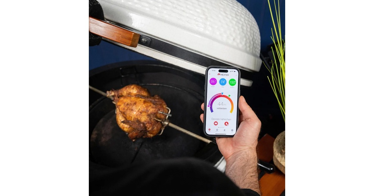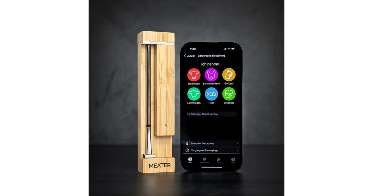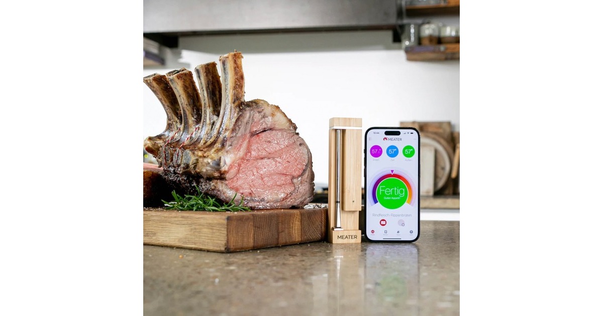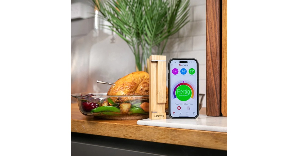 Das MEATER 2 Plus ist ein wirklich drahtloses, smartes Fleischthermometer. Mit dem MEATER 2 Plus holt man sich mehr Freiheit an den Grill, den Smoker oder in die Küche. Er ist noch genauer als der Vorgänger, dank dem patentierten Smart Temp Multisensor misst der neue MEATER Temperaturfühler die Kerntemperatur an fünf verschiedenen Stellen, das ist einzigartig. Jeder Fühler wird einzeln kalibriert und getestet, für eine optimale Garzeitschätzung und punktgenaue Messung. Das schlankste smarte Fleischthermometer ist mit nur 5mm Durchmesser noch 30% dünner als die bisherigen Thermometer. Der neue Vollmetall-Temperaturfühler kann bei Umgebungs-Temperaturen bis zu 550°C verwendet werden und eröffnet damit noch mehr Einsatzmöglichkeiten, zum Beispiel beim Anbraten. Noch höhere Reichweiten bis zu 75 Metern erzielt der MEATER 2 Plus mit Bluetooth 5 Coded Phy und dem überarbeiteten Ladestation-Design. Das drahtlose Thermometer wird einfach in das Fleisch gesteckt. Unabhängig von der Garmethode kann der MEATER in einer Pfanne, einem Ofen, einem Grill oder einer Rotisserie verwendet werden. Er verfügt über sechs Sensoren, fünf für die Kerntemperatur bis zu 105°C, und einen für die Garraumtemperatur bis zu 550°C. Der MEATER 2 Plus lässt sich per Bluetooth mit dem Smartphone, Tablet oder PC verbinden. Die App berechnet anhand von vorgewählter Zubereitungsart, Fleischsorte und Gewicht die optimale Garzeit. Wenn das Fleisch die gewünschte Garstufe erreicht hat, wird der Nutzer über ein Signal benachrichtigt. Der komplette Garprozess kann auf diese Weise verfolgt werden. Die App zeigt den kompletten Temperaturverlauf als Grafik an. Es lassen sich außerdem zeit- und / oder temperaturbasierte Alarme / Benachrichtigungen manuell einstellen. Köstliche Rezept-Videoanleitungen zeigen die richtigen MEATER-Techniken und sorgen für perfekte Ergebnisse. Magnete auf der Rückseite der Ladestation ermöglichen das Befestigen auf metallischen Oberflächen und eine Gumminoppe verhindert Verrutschen.Art.-Nr.: 100029841