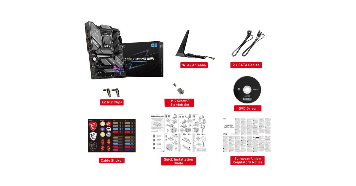 | Zubehörvorhanden | 2x SATA-Kabel, Wi-Fi Antenne, 2x EZ M.2 Clips, I/O Shield, Schnellstartanleitung |