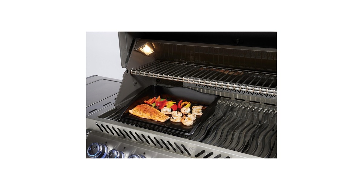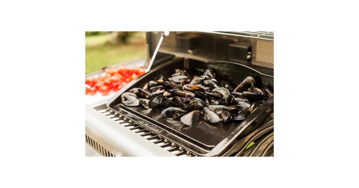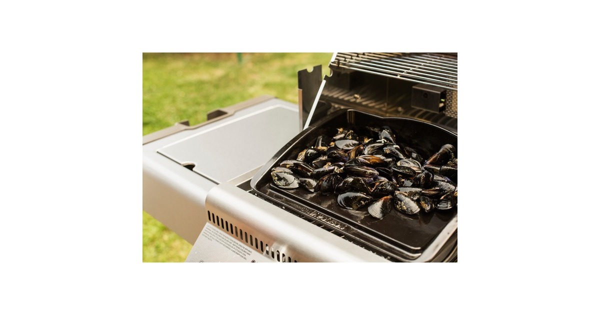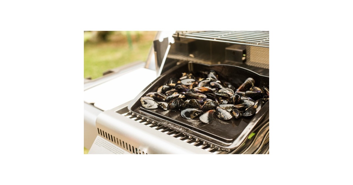 Die porzellanemaillierte Gusseisen-Plancha 56090 von Napoleon eignet sich zum Grillen bei hoher Temperatur. Die 38 x 21cm große Plancha mit extra hohem Rand ist optimal für empfindliche Lebensmittel. Auf der anti-haftenden Oberfläche lassen sich Fisch, Meeresfrüchte, Burgerpatties, Speck und kleinteiliges Gemüse lecker grillen, wobei Fette und Säfte dank der schrägen Oberfläche abgeleitet werden. So gelingen die Gerichte besonders kross und garen nicht im eigenen Saft.Art.-Nr.: 1404557