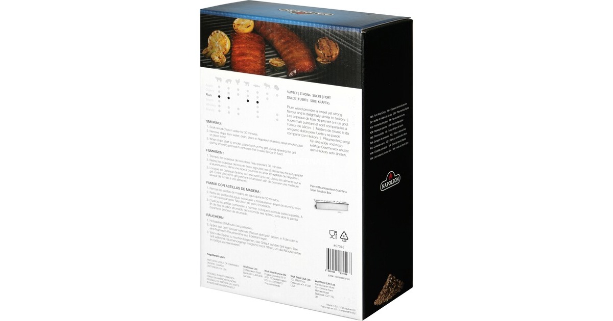 Die Napoleon Pflaumenholz Räucherchips 67016 verleihen dem Grillgut ein kräftiges süßliches Aroma. Für das optimale Aroma legt man die Räucherchips mindestens 30 Minuten vor der Verwendung in Wasser, Apfelsaft, Ale, Wein oder Most, Chardonnay, Pinot Noir oder Ananassaft ein. Dann nimmt man die Räucherchips aus der Flüssigkeit, füllt sie in die Napoleon Räucherpfeife und platziert diese über den Flammenschutzeinsätzen. Man kann die Räucherchips auch direkt in den integrierten Räuchereinsatz des Prestige PRO665RSIB füllen oder auf den glühenden Kohlen im Apollo Smoker AS300K oder AS200K platzieren. Wenn die Chips zu rauchen beginnen, legt man das Grillgut auf und schließt den Grilldeckel.Art.-Nr.: 1591758