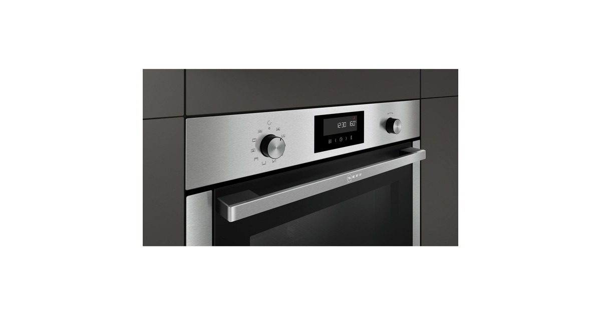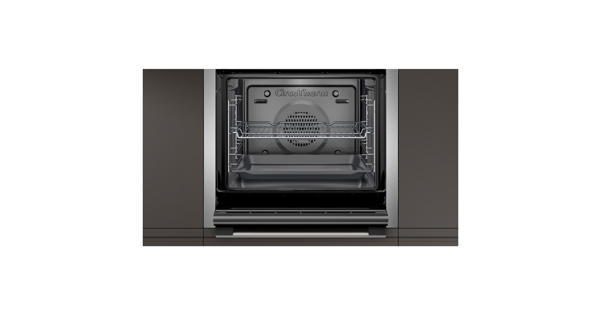 Der Einbaubackofen Neff B6CCH7AN0 ist mit einem Nutzinhalt von 71 Litern optimal für jede Küche geeignet und lässt sich als Einbaugerät nahezu überall platzieren. Acht Heizarten lassen sich über die voll versenkbaren Bedienknebel bequem einstellen. Das Heißluftsystem CircoTherm ermöglicht gleichzeitiges Backen, Braten und Garen auf bis zu 3 Ebenen. Die Schnellaufheizung des B6CCH7AN0 sorgt für eine verkürzte Aufheizdauer. Das hydrolytische Reinigungssystem EasyClean ermöglicht die einfache und energiesparende Reinigung des Backofeninnenraums zwischendurch. Mit Aktivierung der Pyrolyse-Selbstreinigungsfunktion werden Schmutz, Fett und Essensreste bei hohen Temperaturen zu Asche zersetzt, die im Anschluss ganz leicht mit einem feuchten Tuch weg gewischt werden kann. Auch in puncto Sicherheit bleiben beim B6CCH7AN0 mit eingebautem Kühlgebläse, einer individuell einstellbaren Kindersicherung, einer automatischen Sicherheitsabschaltung sowie einer Restwärmeanzeige keine Wünsche offen. Besonderen Komfort bietet die voll versenkbare Backofentür (Hide). Art.-Nr.: 1541269