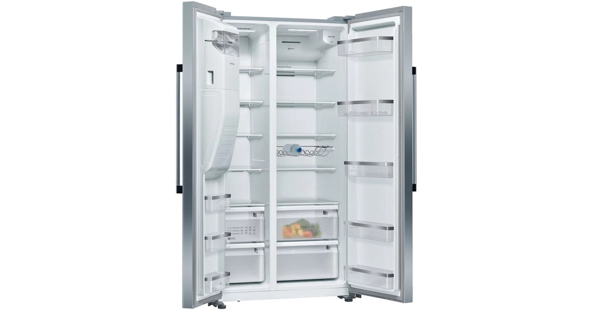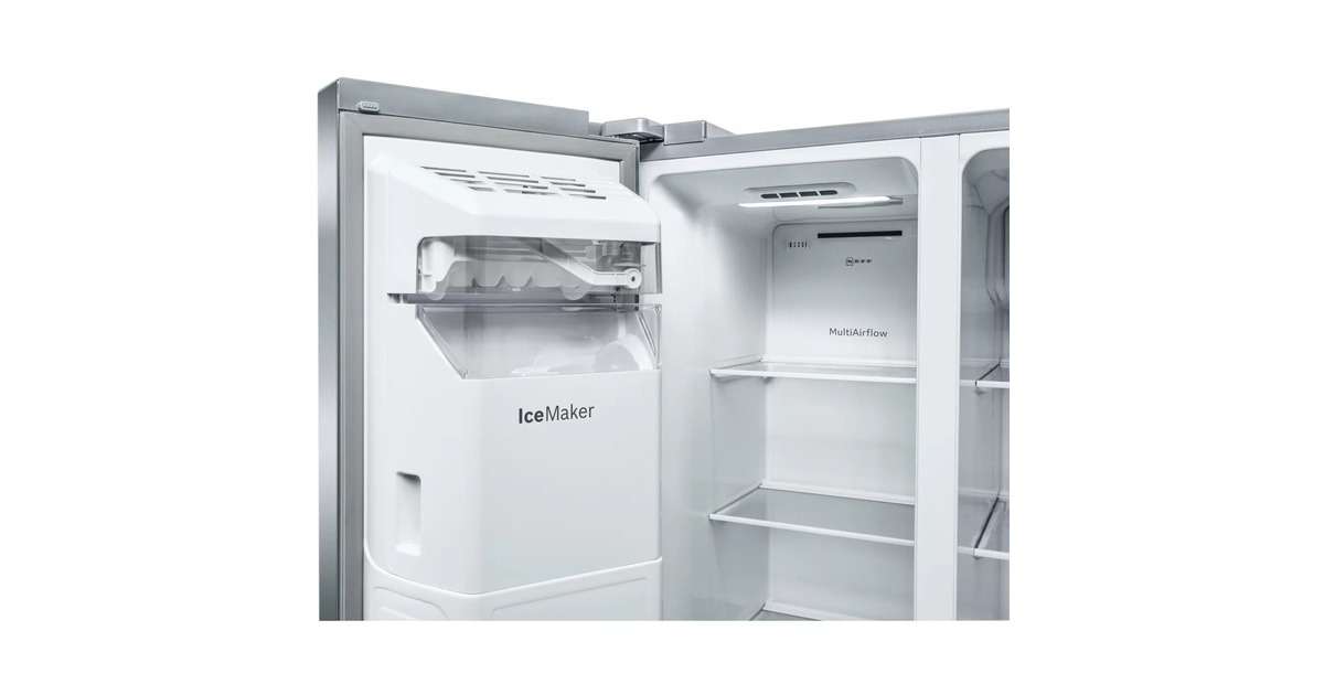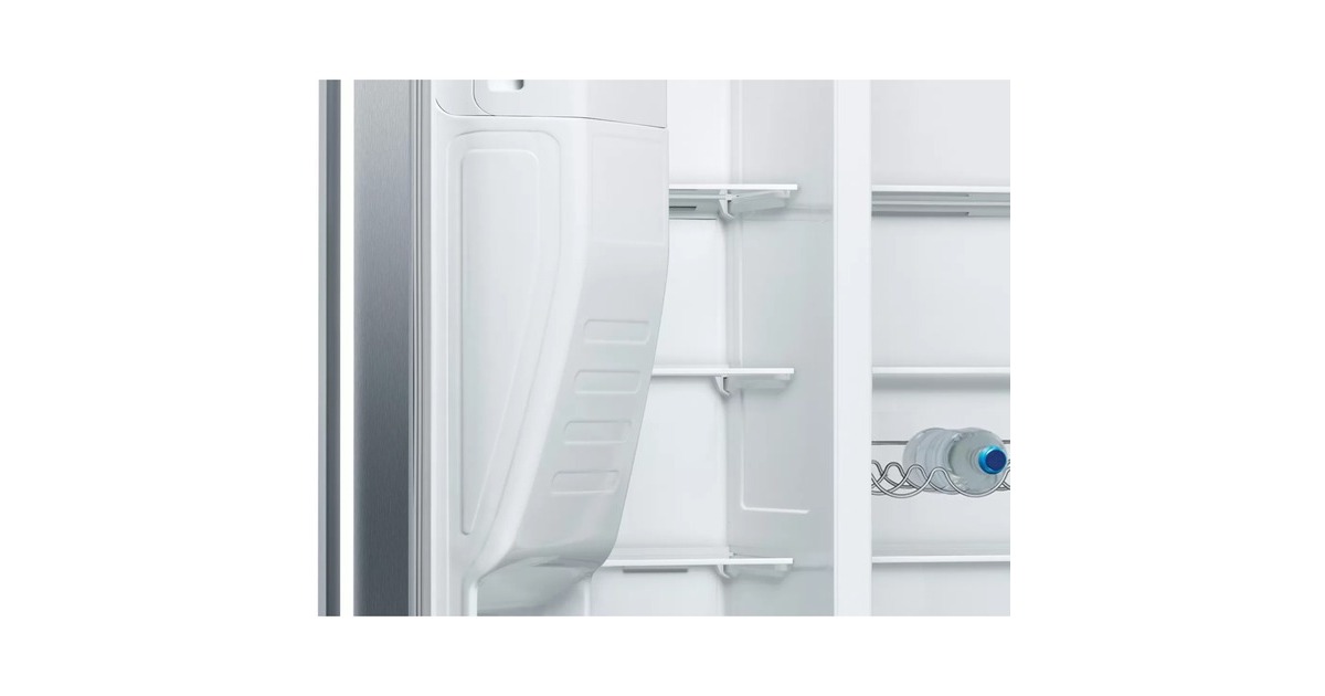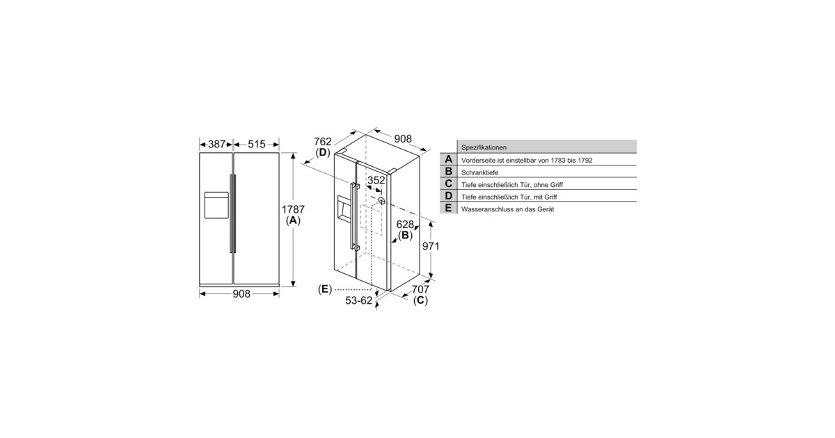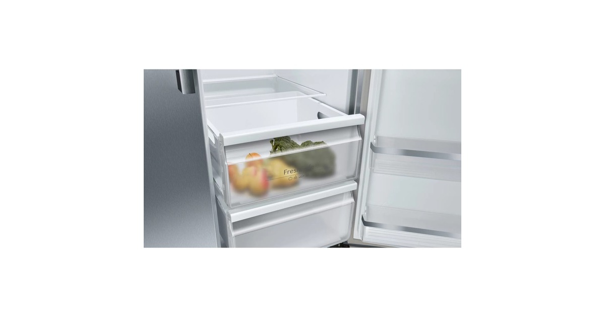 Der Side-by-Side Neff KA3923IE0 ist mit seinem Gesamtnutzinhalt von 562 Litern ideal für den großen Haushalt geeignet und bietet viel Komfort. Das 371 Liter umfassende Kühlteil mit MultiAirflow-System ist mit fünf Abstellflächen aus Sicherheitsglas, zwei transparenten FreshSafe Schubladen auf Rollen zur Lagerung von Obst und Gemüse sowie fünf Türfächern ausgestattet. Der 4-Sterne-Gefrierraum mit NoFrost-Technologie gegen Eis- und Reifbildung umfasst 185 Liter und stellt zwei transparente Gefrierschubladen, drei Abstellflächen aus Sicherheitsglas sowie drei Türfächer zur Verfügung. Crushed Eis, Eiswürfel oder kaltes Trinkwasser sind bei Betätigung der Spendertaste mit LED-Beleuchtung umgehend verfügbar. Die Temperaturregelung des KA3923IE0 erfolgt über das in Tür integrierte Display, mit dem man alles im Blick und perfekt unter Kontrolle hat. Besonders praktisch sind auch die Funktionen SuperKühlen und SuperGefrieren, jeweils mit automatischer Deaktivierung. Mit einem Stromverbrauch von 324 kWh im Jahr ist der KA3923IE0 in die Energieeffizienzklasse E eingestuft.Art.-Nr.: 1675188