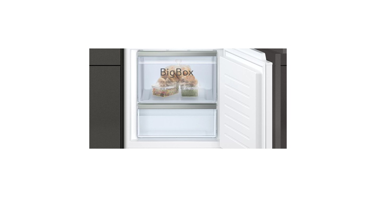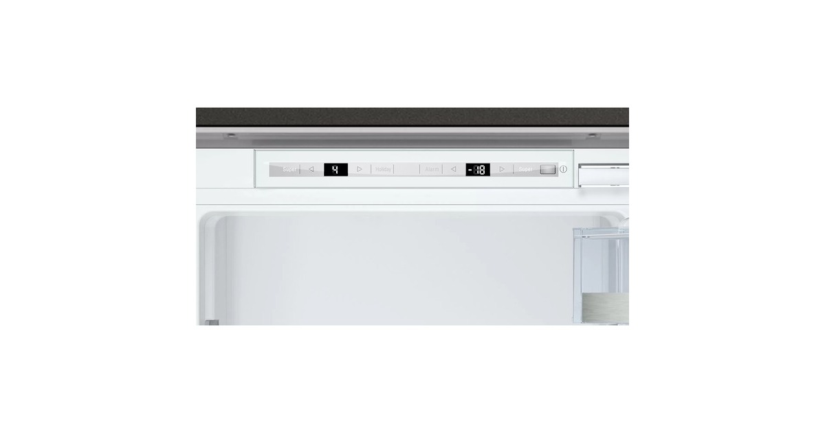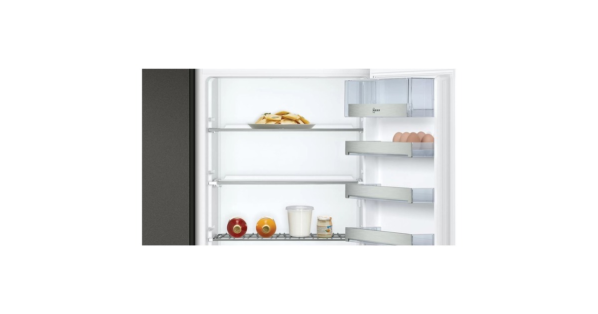 Die vollintegrierbare Kühl-/Gefrierkombination Neff KI6873FE0 stellt einen Gesamtnutzinhalt von 272 Litern zur übersichtlichen Lagerung frischer Lebensmittel zur Verfügung und bietet viel Komfort. Der 209 Liter fassende Kühlraum ist mit fünf Abstellflächen aus Sicherheitsglas, davon vier höhenverstellbar, eins teil- und eins ausziehbar, sowie fünf Türfächern ausgestattet. In der FreshSafe2 Schublade mit erhöhter Luftfeuchtigkeit und einer Temperatur von +4° C bleiben Obst und Gemüse bis zu zweimal länger frisch und knackig. Der dank VarioZone flexibel nutzbare Gefrierbereich umfasst 63 Liter und stellt zwei transparente Gefrierschubladen zur Verfügung, davon eine BigBox um großes Gefriergut optimal zu lagern und zu stapeln. Die LowFrost-Technologie sorgt für eine geringere Eisbildung und ermöglicht somit ein schnelleres Abtauen. Des Weiteren hat die KI6873FE0 eine SuperKühlen-Funktion mit automatischer Deaktivierung und eine SuperGefrieren-Funktion mit Eingefrierautomatik zu bieten und VitaControl sorgt für eine konstante Temperatur durch intelligente Sensortechnik. Mit einem Stromverbrauch von 207 kWh im Jahr ist die KI6873FE0 in die Energieeffizienzklasse E eingestuft.Art.-Nr.: 1675154