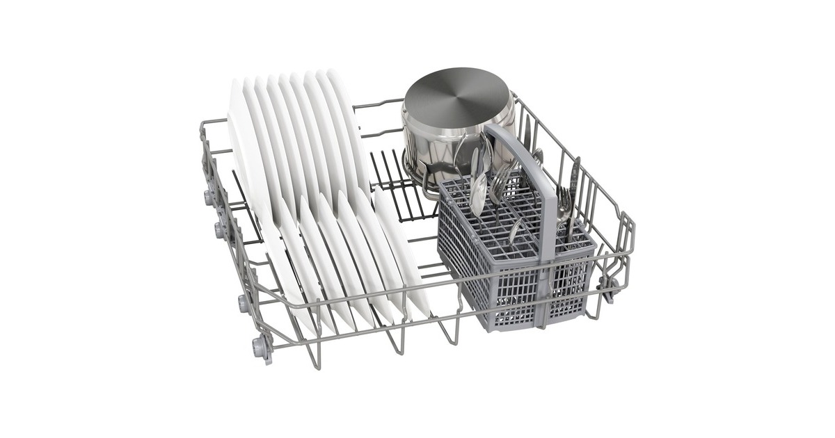 Komfortrollen, Korbstopper (Rack Stopper), Klappbare Tellerhaltereihen (2x), Besteckkorb |