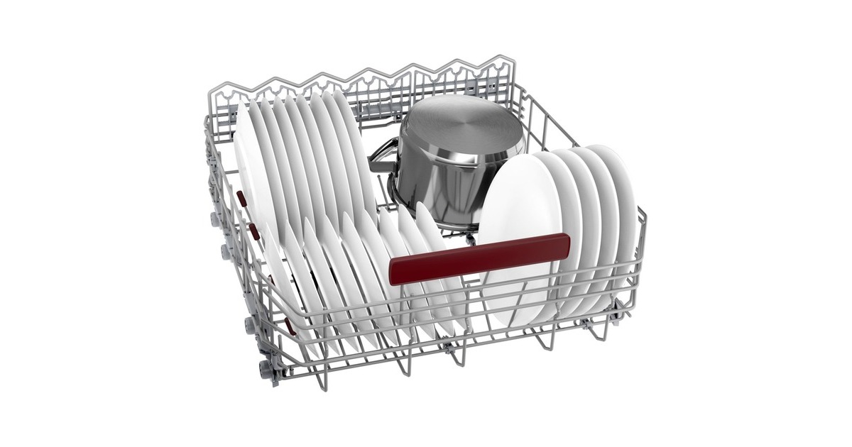 Komfortrollen, Korbstopper (Rack Stopper), 6x Klappbare Tellerhaltereihen, Tassenablage (2-teilig), Gläseranlagebügel |