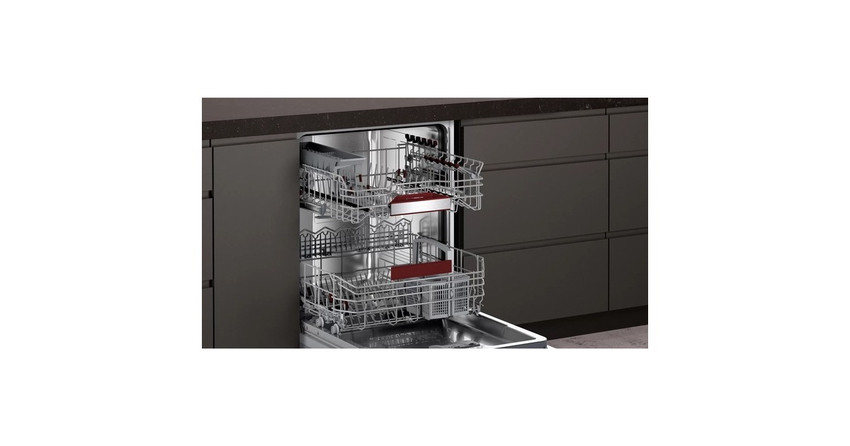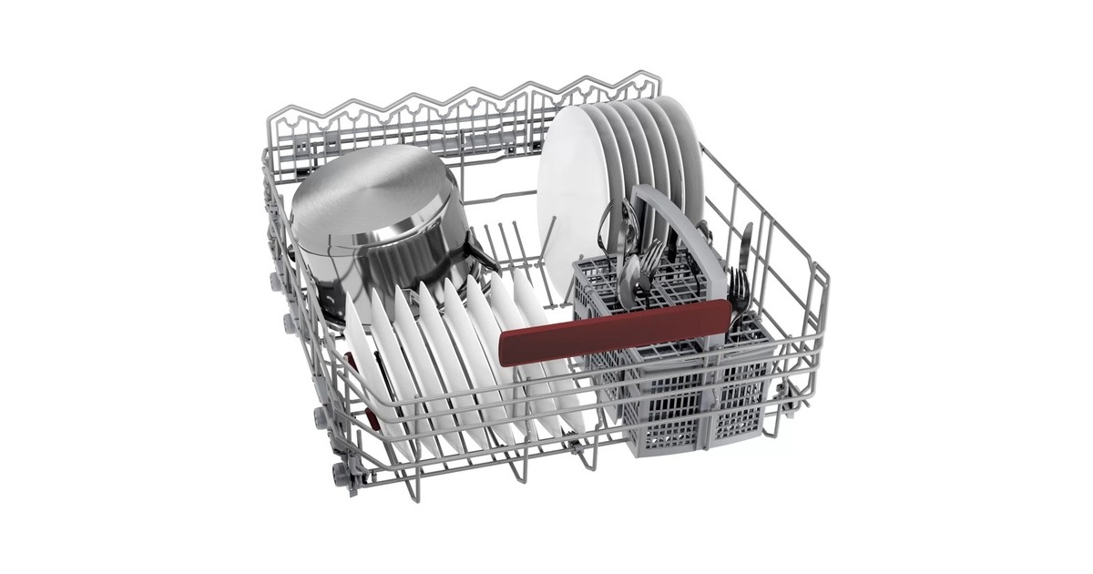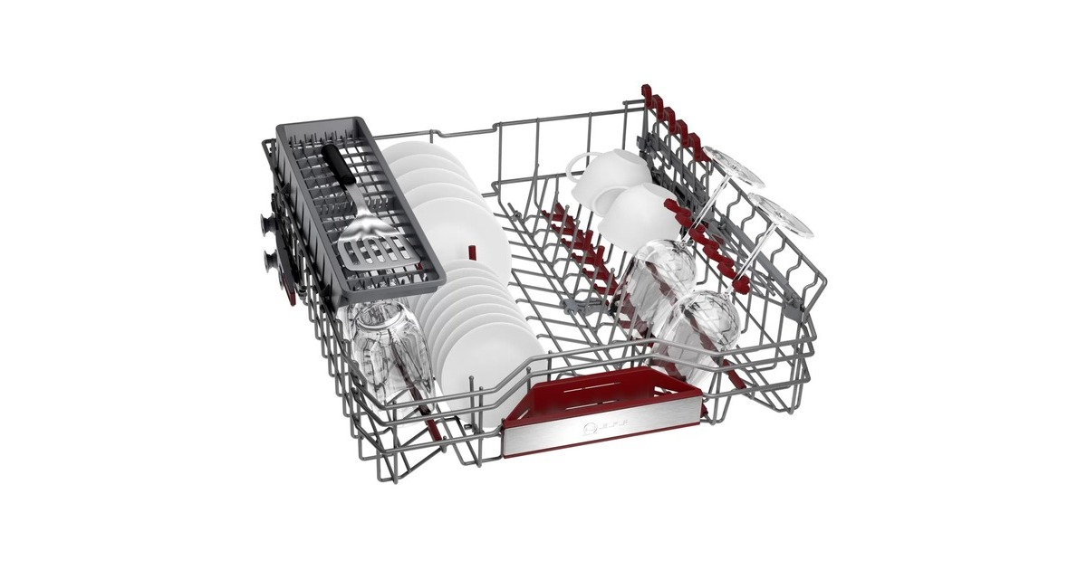 Komfortrollen, 6x klappbare Tellerhaltereihen, VarioBesteckkorb, 2-teilige Tassenablage, Gläseranlagebügel |