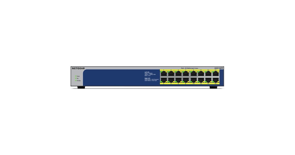Die NETGEAR Gigabit Unmanaged Switch-Serie unterstützten Unternehmen dabei, Ihr Netzwerk kostengünstig auf Gigabit-Geschwindigkeiten und höhere Portzahlen auszuweiten. Der GS516PP ergänzt die Serie und bietet 16 PoE+ Ports für die Stromversorgung von PoE-Geräten mit hoher Leistung. Mit einem PoE-Gesamtbudget von 260 W können Unternehmen viele PoE+ Geräte auf einem einzigen Switch statt auf mehreren Switches bereitstellen. Der GS516PP ist energieeffizient, auf lange Lebensdauer ausgelegt und wird intensiv getestet, um die Zuverlässigkeit zu bieten, die das Unternehmen benötigt. Priorisierung des 802.1p-Datenverkehrs und Jumbo Frame Support gestatten die nahtlose Integration in komplexere Netzwerke.