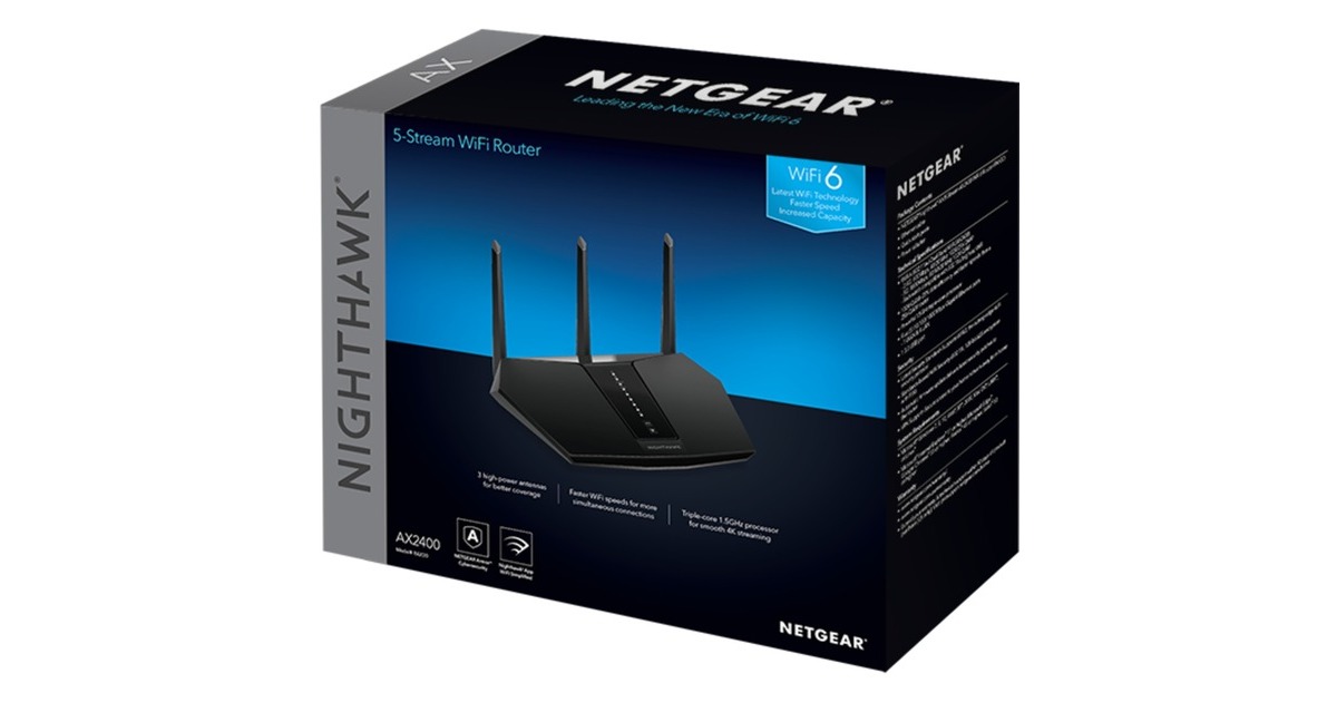 Der Netgear Nighthawk AX WiFi-6-Router ist ein Upgrade auf echtes High-Performance WLAN. Mit einem leistungsstarken 1,5 GHz Triple-Core Prozessor liefert er blitzschnelle Internetgeschwindigkeiten und zuverlässig Konnektivität zu jedem Gerät im Netzwerk, sodass 4K-UHD-Inhalte ohne Unterbrechung auf Smart-TVs, Mobilgeräte und Spielekonsolen mit bis zu 2,4 Gbit/s wireless Geschwindigkeite gestreamt werden können.Art.-Nr.: 1789853