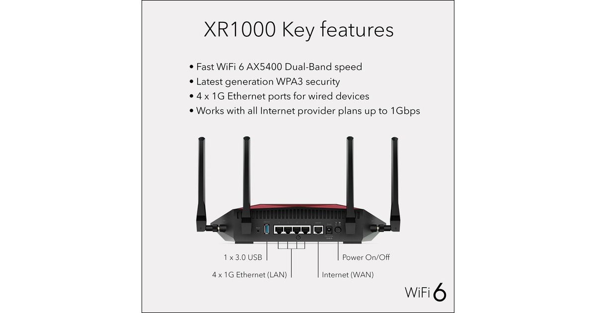 Spiel frei und ohne Unterbrechung mit WiFi 6 - Mit dem Netgear Nighthawk XR1000 reduzieren Benutzer die Überlastung des Netzwerks um mit Höchstgeschwindigkeit zu spielen. WiFi 6 bietet eine 40% schnellere Geschwindigkeit, die das Onlinegaming und Cloud-Spielerlebnis verbessert. Es ermöglicht mehre Geräten gleichzeitig zu benutzen und z.B. Videos zu streamen, ohne die Geschwindigkeit oder Zuverlässigkeit zu beeinträchtigen, indem Daten effizient gepackt und geplant werden. OFDMA und MU-MIMO reduzieren den Netzwerkjitter und die Latenz.Art.-Nr.: 1696495