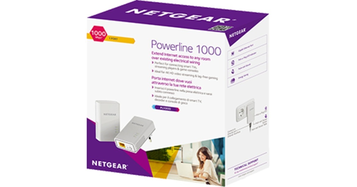 Mit dem PL1000 Kit erweitert man seinen kabelgebundenen Internetzugang durch vorhandene elektrischen Leitungen auf jeden Raum im Haus. Man steckt den Powerline 1000 einfach in eine Steckdose und steckt das Gerät in den Adapter ein. So einfach ist es. Mit 1000 Mbit/s Geschwindigkeit und Homeplug AV-Unterstützung ist der Powerline 1000 Adapter perfekt für den Anschluss von Smart TVs, Streaming-Playern und Spielekonsolen.