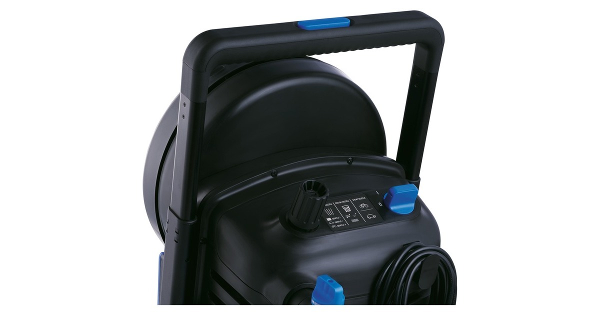 Netzkabel-Aufwicklung, Schlauchtrommel, Fach für Düsen, integrierte Lanzenhalterung |