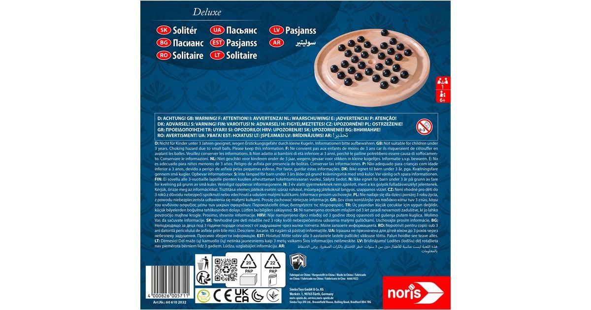 Diese aus Holz hergestellte Version von Solitaire funktioniert nach dem klassischen Spielprinzip: Zu Beginn des Spiels liegt auf jedem Feld eine Kugel, nur das Feld in der Mitte bleibt leer. Eine Kugel darf eine angrenzende Kugel waagerecht oder senkrecht überspringen und muss dabei immer auf einem freien Feld landen. Die übersprungene Kugel wird aus dem Spiel genommen. Wenn keine Kugel mehr übersprungen werden kann, endet das Spiel. Je weniger Kugeln dann noch auf dem Brett liegen, desto besser. Ist nur noch eine Kugel übrig, so wurde Solitaire gemeistert. Solitaire wird alleine gespielt und ist in dieser hochwertigen Variante auch ein tolles Deko-Objuekt.Art.-Nr.: 1916111