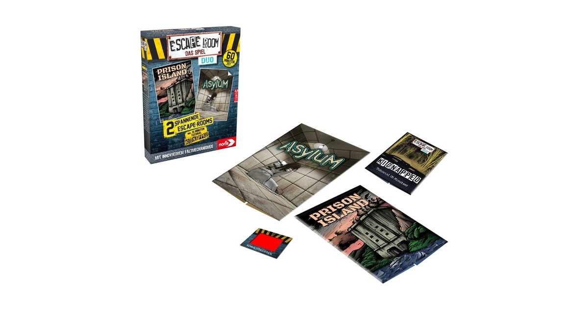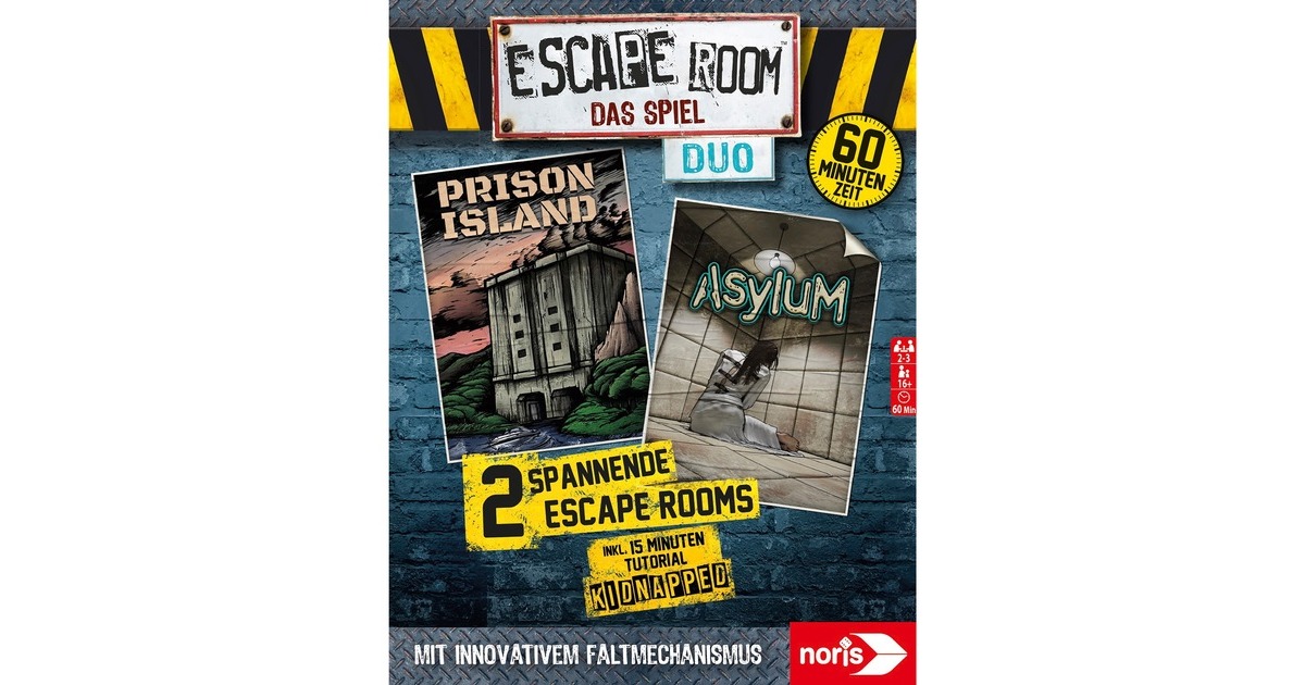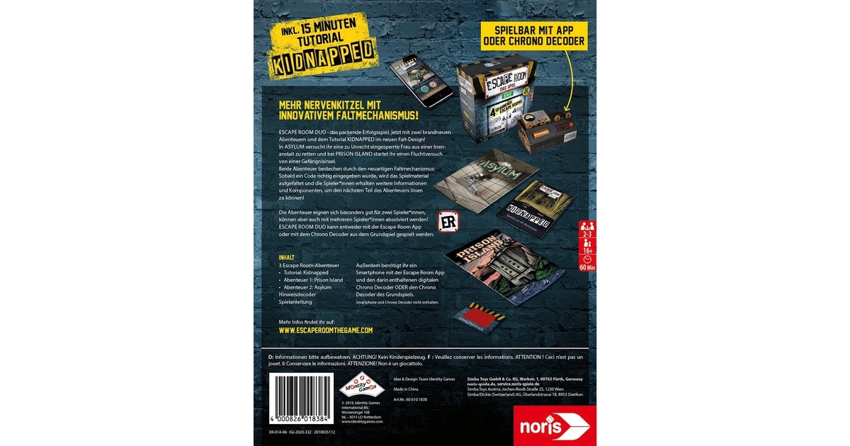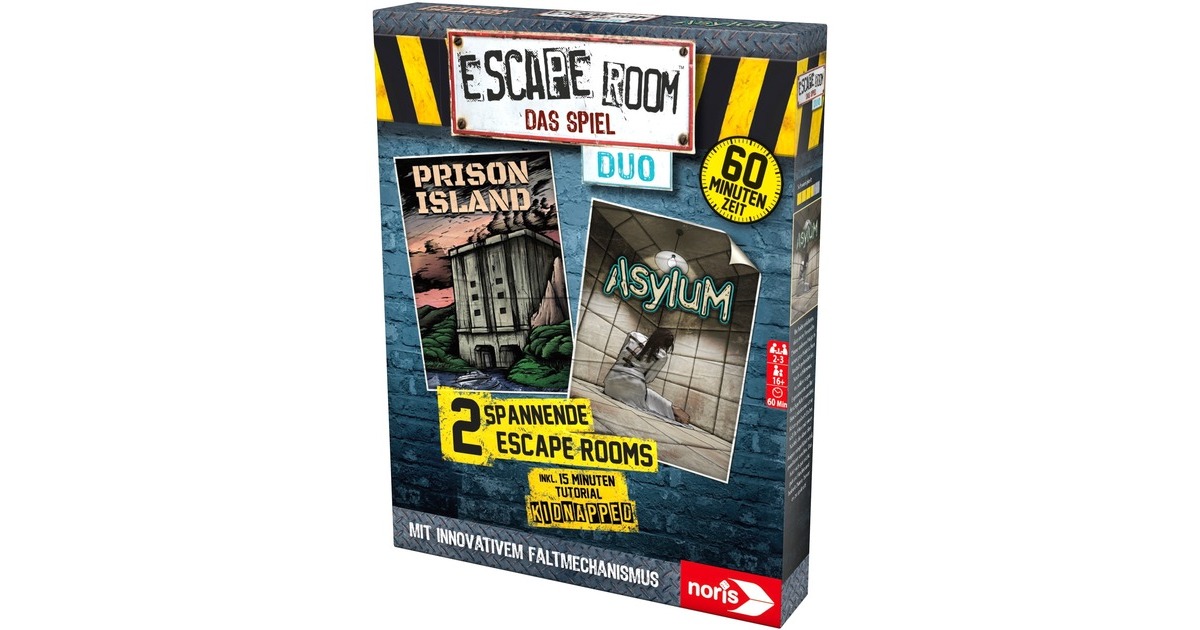 Escape Room Duo - das packende Erfolgsspiel, jetzt mit zwei brandneuen Abenteuern im neuen Falt-Design! Im „Asylum" ist es das Ziel der Spieler, eine zu Unrecht eingesperrte Frau aus einer Irrenanstalt zu retten, während beim „Prison Island" die Flucht im Vordergrund steht. Beide Abenteuer bestechen durch den neuartigen Falt-Mechanismus: Sobald ein Code richtig eingegeben wurde, wird das Spielmaterial aufgefaltet und die Spieler erhalten weitere Informationen und Komponenten, um den nächsten Teil des Abenteuers lösen zu können! Die Abenteuer eignen sich besonders für zwei Spieler, können aber auch mit mehreren Spielern absolviert werden! Escape Room Duo kann entweder mit der Escape Room App oder mit dem Chrono Decoder gespielt werden.Art.-Nr.: 1529354
