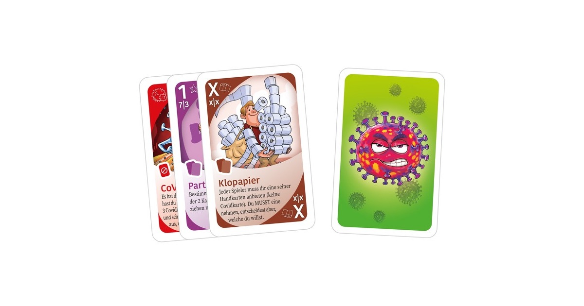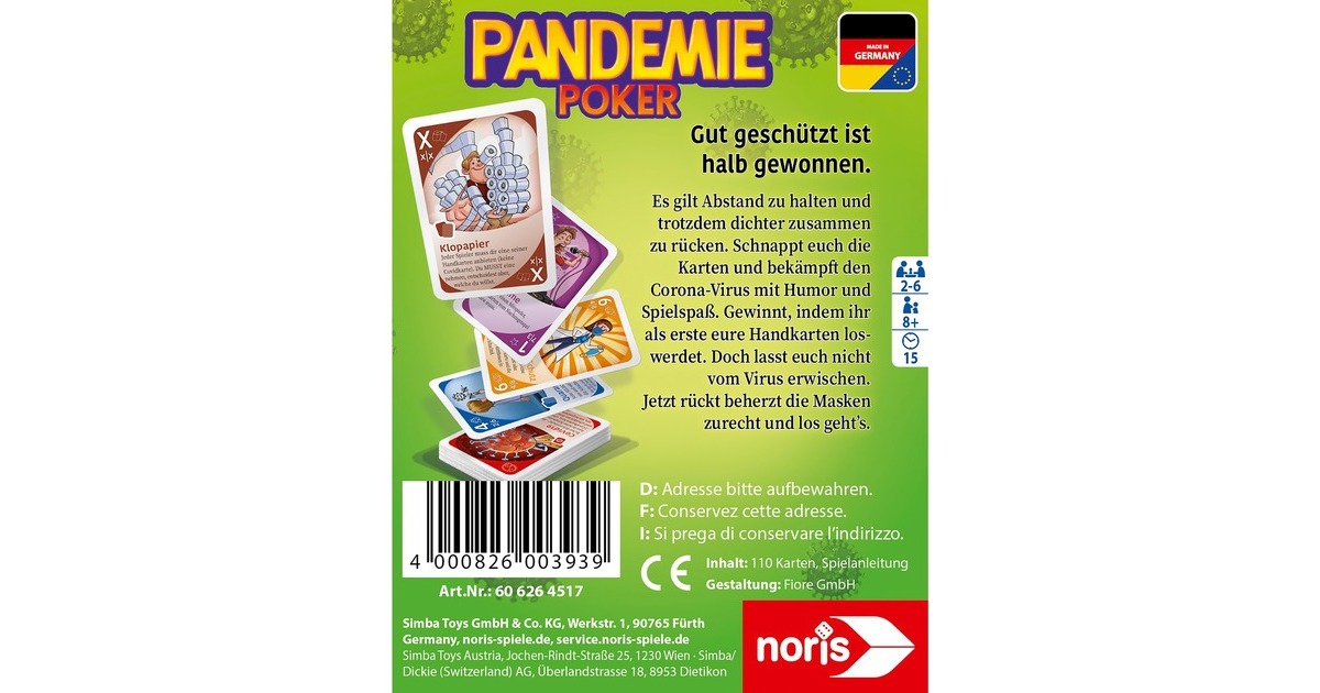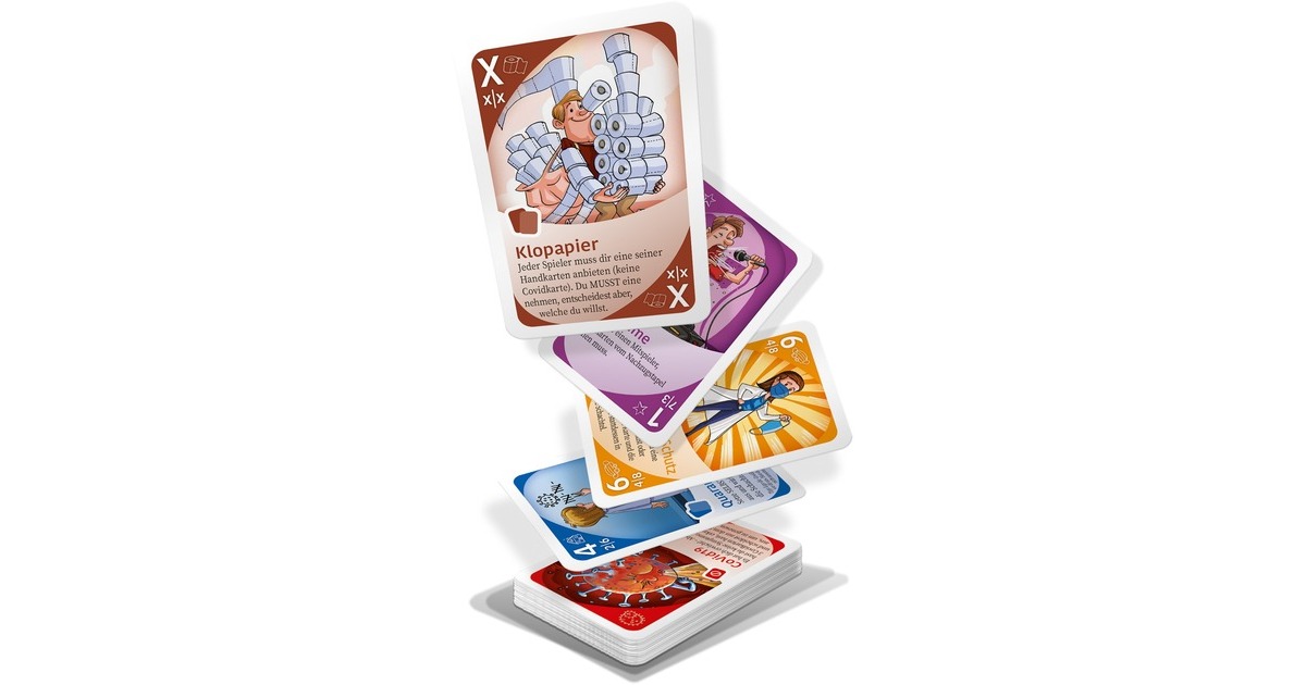 Gut geschützt ist halb gewonnen! Bei dem humorvoll-lehrreichen Kartenspiel "Pandemie Poker" möchte sich jeder vor den ansteckenden Viren schützen. Mund-Nasen-Schutz oder Desinfektionsmittel kommen euch zugute und auch ein paar Rollen Klopapier können euch mal weiterhelfen. Es gilt Abstand zu halten, auch was die Spielkarten betrifft: die Karten haben verschiedene Werte und dürfen nur mit einem bestimmten (Zahlen-)Abstand auf den Ablagestapel gelegt werden. Jede Karte hat eine Zusatzfunktion, die für dich oder deine Mitspieler einen Vor- oder Nachteil haben kann. Wer es schafft, all seine Handkarten abzulegen, gewinnt das Spiel. Das Spiel ist für 2-6 Spieler ab 8 Jahren geeignet und dauert 15 Minuten.Art.-Nr.: 1719905