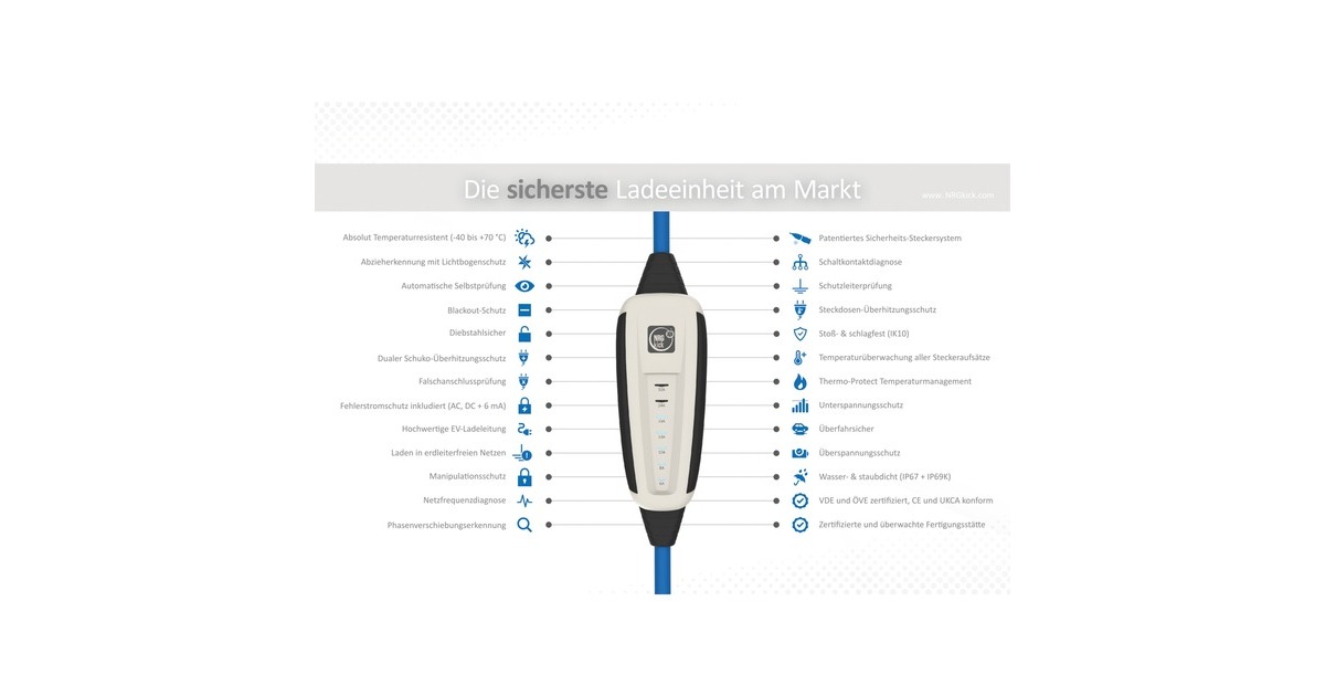 Die hochinnovative, transportable Ladeeinheit NRGkick ist eine der sichersten und intelligentesten Ladeeinheiten am Markt. Mit NRGkick ist es möglich, an jeder Standardsteckdose und sogar an öffentlichen Ladesäulen schnellstmöglich zu laden (mit bis zu 22 kW, 1-/2-/3-phasig). Das bahnbrechende, patentierte Sicherheits-Steckersystem mit Temperaturüberwachung an jedem Phasenpin sorgt dafür, dass verschmorte Steckdosen ausgeschlossen sind, egal ob CEE32, CEE16 oder normale Haushaltssteckdose. Innovationen wie das autonome Lastmanagement, Blackout-Schutz, örtlich zuordenbare Ladeberichte über WLAN und die Möglichkeit, jederzeit weitere Funktionen über die App upgraden zu können (wie z.B. photovoltaik-geführtes Laden mit Phasenumschaltung), belegen, dass man mit NRGkick technisch nicht nur bloß auf der Höhe der Zeit, sondern weit darüber hinaus liegt. Mit NRGkick können alle E-Autos mit Typ 2 Schnittstelle, egal ob 1-, 2- oder 3-phasig, mit der maximal möglichen AC-Ladegeschwindigkeit geladen werden (bis zu 22 kW). Im Vergleich zur Haushaltssteckdose bedeutet das, dass die Ladung bis zu 10x schneller erfolgt. Beim Anschluss an gewöhnliche Haushaltssteckdosen beachtet NRGkick natürlich die jeweils länderspezifisch geltenden Vorschriften. NRGkick bietet zum Teil noch nie dagewesenen Sicherheitsfunktionen, wie z.B das patentierte Sicherheits-Steckersystem mit Abzieherkennung und Lichtbogenschutz sowie Temperaturüberwachung für jeden Steckeraufsatz an jedem einzelnen Phasenpin, Schutzleiterprüfung mittels Schleifenimpedanzmessung, inkludierten Fehlerstromschutz (AC, DC + 6 mA), Netzfrequenzdiagnose, automatische Selbstprüfung, Diebstahl- und Manipulationsschutz, Überfahrsicherheit und mehr. NRGkick verfügt über eine Bluetooth- und WLAN Schnittstelle sowie Zugang zur NRGkick Cloud und der Web API. Über die kostenfreie NRGkick App für iOS und Android kann man somit jederzeit auf die Ladeeinheit zugreifen und alle erweiterten Funktionen nutzen. Damit Unbefugte keinen Zugriff auf den NRGkick haben, ist dieser passwortgeschützt. Nur mit dem korrekten Passwort ist es möglich, Einstellungen in der App vorzunehmen. Die geringen Abmessungen und die handliche Größe sorgen dafür, dass sie im Gegensatz zu fest installierten Wallboxen bei Bedarf ganz einfach überall hin mitgenommen werden kann. Dank des extrem geringen Gewichts von weniger als vier Kilogramm bei der 5m Variante und der besonders flexiblen, hochwertigen Ladeleitung ist NRGkick besonders platzsparend auf Reisen. NRGkick ist nicht nur upgradefähig, sondern via Over-the-Air (OTA) Updates auch absolut zukunftssicher, da neue Funktionen und Verbesserungen automatisch vom NRGkick heruntergeladen werden und sofort zur Verfügung stehen.Art.-Nr.: 100006597