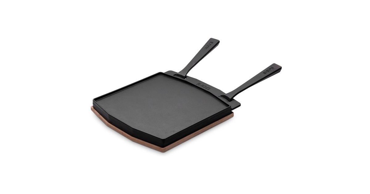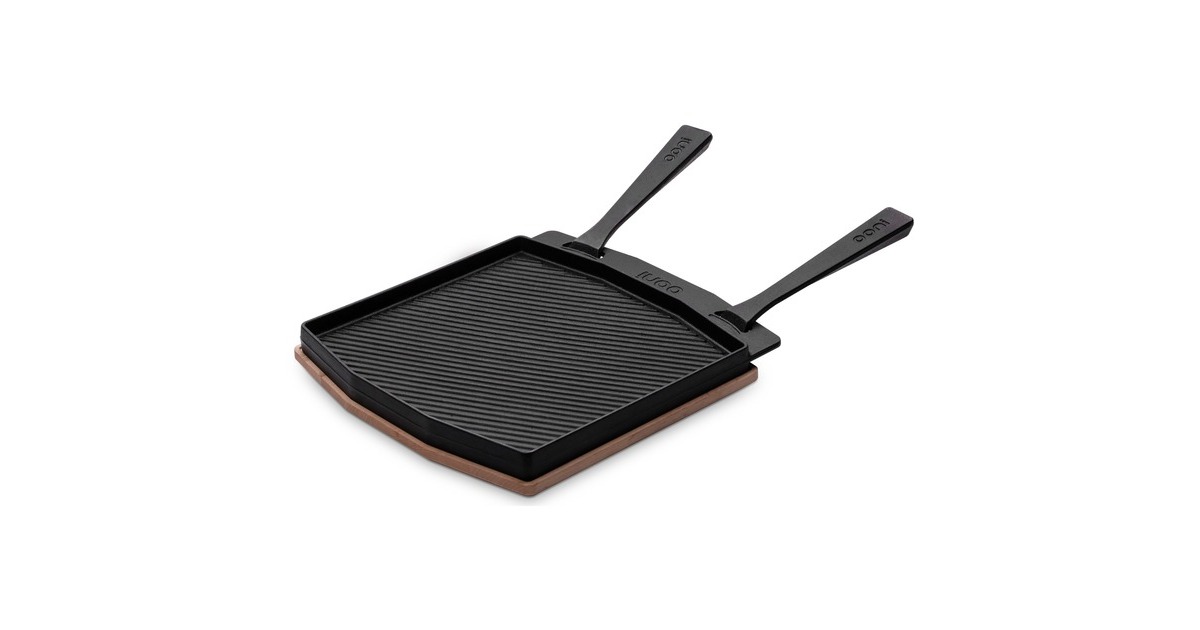 Wende-Grillpfanne, 2x Gusseisen-Griff (abnehmbar), Holz-Untersetzer |