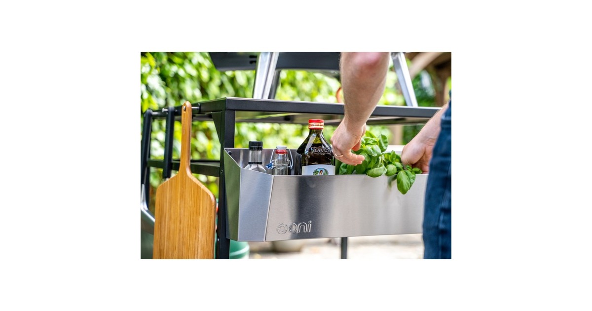 Die praktische Aufbewahrungsmöglichkeit lässt sich an der Vorderseite des Ooni Küchentisches anbringen. Das speziell für den Ooni-Küchentisch entworfene Edelstahlfach ist strapazierfähig und ergänzt den Küchentisch ideal. So sind Utensilien und das kühle Bier immer in griffweite.Art.-Nr.: 1762039