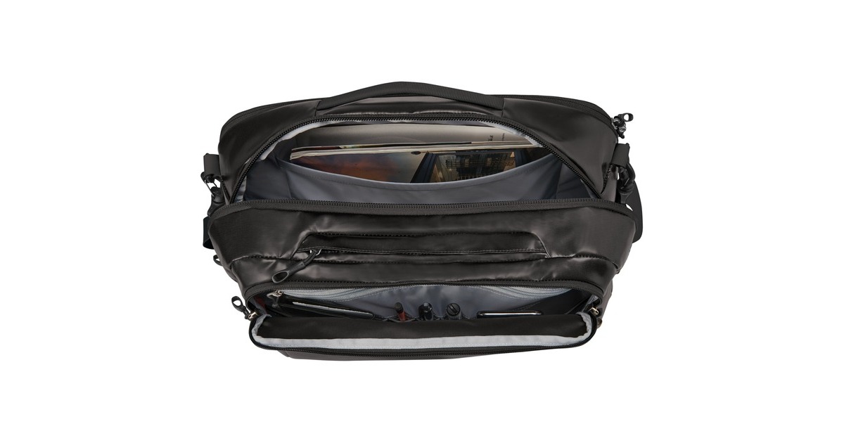 Gepolstertes Laptopfach mit direktem Reißverschlusszugang, Reißverschlusszugang zum Hauptfach, Fach für kratzfreien Transport von Sonnenbrillen und elektronischen Geräten, vorderes Organisationsfach, Innenfächer aus Mesh |