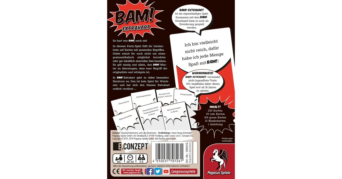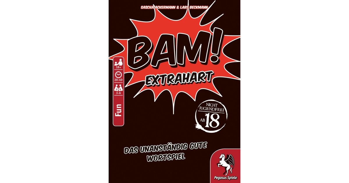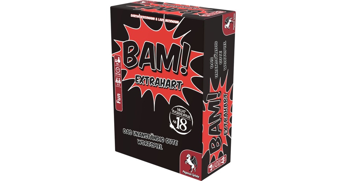 BAM! ist das freche Partyspiel, bei dem Schlag auf Schlag derbe bis geniale Wortspiele entstehen. Das beliebte Spielprinzip erschließt mit BAM! Extrahart neue Dimensionen der Unanständigkeit. Spieler ab 18 Jahren können hier als Grenzgänger des guten Geschmacks im Sekundentakt Tabus brechen. Eigenständig spielbar und mit BAM! kombinierbar. Nicht jugendfrei!Art.-Nr.: 1347171