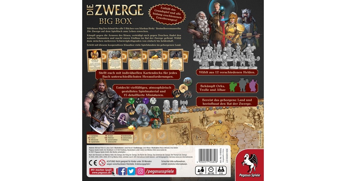 In Die Zwerge tauchen die Spieler in die Welt von Markus Heitz‘ gleichnamigen Bestsellerroman ein. Sie schließen sich zusammen, um gemeinsam das Geborgene Land gegen böse Orks, Trolle und Albae zu verteidigen. Dabei greift jedes Szenario die Inhalte aus einem anderen Band der fünfteiligen Romanreihe auf. So können die Spieler die komplette Saga spielerisch erleben. Jeder Spieler übernimmt die Rolle eines der Helden aus den Die Zwerge-Büchern. Dabei hat jeder Held andere Attribute und Sonderfähigkeiten. Sind die Spieler am Zug, bewegen sie sich über die Karte, führen Aufträge aus, schicken Nachrichten zum Rat oder bekämpfen die Armeen des Bösen. Die Spieler müssen eine festgelegte Anzahl an Szenario- oder Sagakarten erfolgreich erfüllen, bevor ihnen die Zeit ausgeht oder die feindlichen Armeen das Geborgene Land eingenommen haben.Art.-Nr.: 1623209