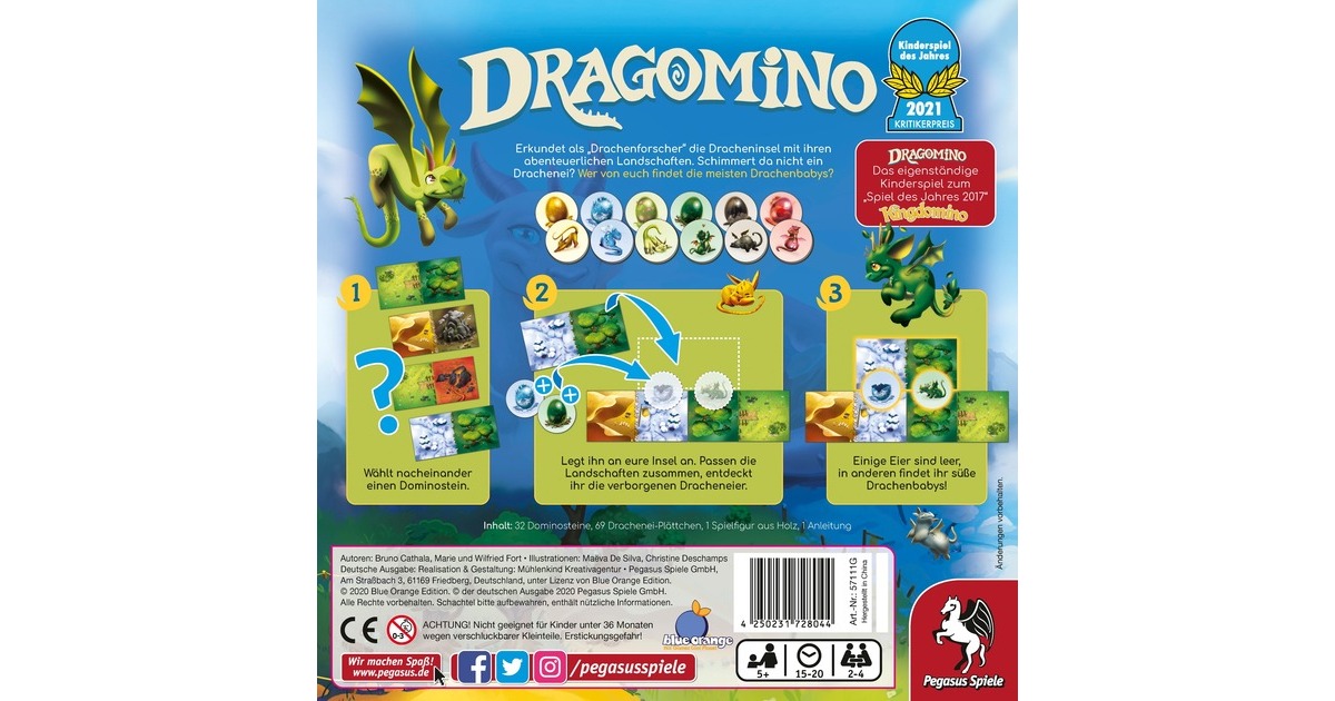Der große Moment ist gekommen - als frisch ernannte Drachenforscher machen sich die Spieler auf den Weg zu einer geheimnisvollen Insel. Ihr Ziel ist es, möglichst viele süße Drachenbabys zu finden. Dazu erkunden sie Stück für Stück die Insel, dargestellt durch bunt illustrierte Dominosteine. Wann immer sie Dominosteine so platzieren, dass die abgebildeten Landschaften zusammen passen, entdecken sie dort ein Drachenei. Schlüpft daraus ein Baby, gibt es am Ende des Spiels einen Punkt dafür, ist das Ei leer, gibt es keine Punkte, dafür darf man aber in der nächsten Runde als Erster einen neuen Dominostein nehmen.Art.-Nr.: 1772906